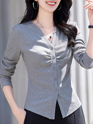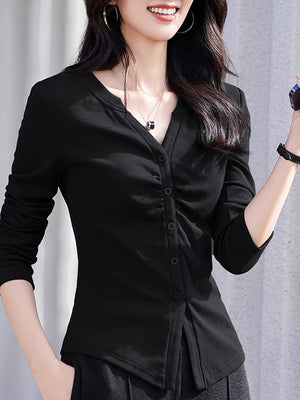 Casual V-Neck Long Sleeve T-Shirt - High Elasticity Semi-Sheer Button-Up Top