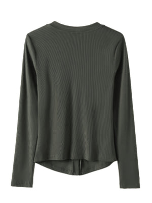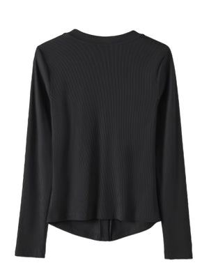 Expertly crafted with high elasticity fabric and a semi-sheer material, this V-neck long sleeve T-shirt is perfect for fashion lovers. Its minimalist style, solid black color, and button details make it a versatile choice for spring and fall. Stay comfortable and cool with its breathable and machine-washable design.