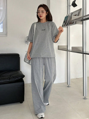 2pcs/Set Women Letter Print Loose Fit Crew Neck T-Shirt And Drawstring Pants