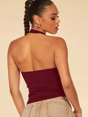 This playful halter tank top doubles as a chic beach cover-up, perfect for sunny days by the shore. Its slim fit and regular length highlight your silhouette, while the backless, ruched design adds a flirty touch. Crafted in classic black, this adorable crop top pairs effortlessly with your favorite summer essentials for a casual, stylish vibe.