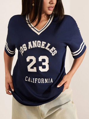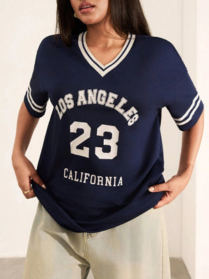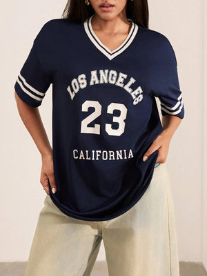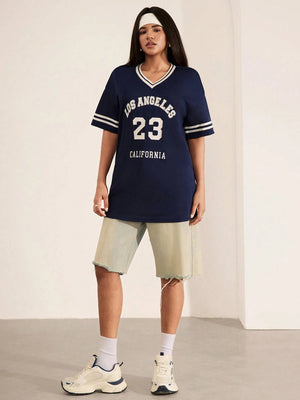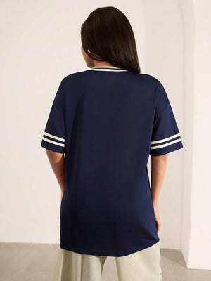 This oversized V-neck pullover T-shirt blends casual comfort with modern style. Featuring a drop shoulder and short sleeves, the long-length design ensures relaxed coverage, while the letter and striped graphic pattern adds visual interest. Contrast binding offers a refined finish, making it ideal for home wear with effortless appeal.