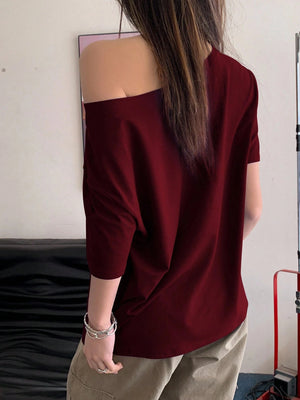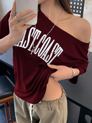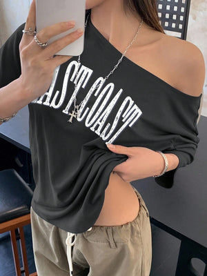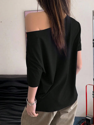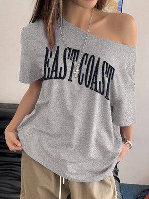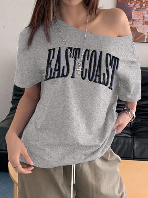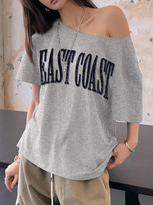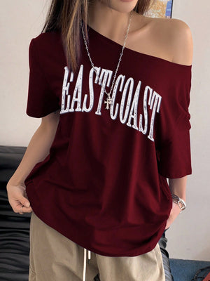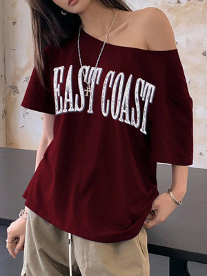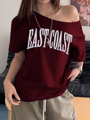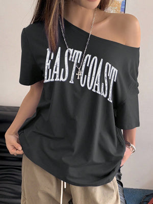 Off-Shoulder Short Sleeve Letter Printed Casual T-Shirt Graphic Tees Women Tops
