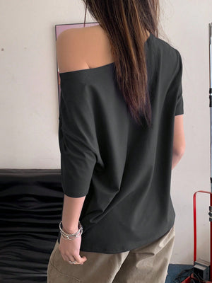 This off-shoulder casual t-shirt features a scoop neckline and drop shoulder short sleeves for a relaxed, contemporary look. Its oversized fit and regular length ensure comfortable wear, while the asymmetrical colorblock and letter print add a stylish graphic element. Perfect for effortless everyday styling with a modern edge.