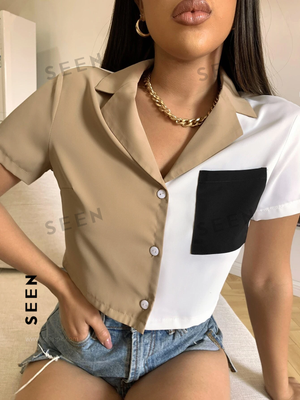 Introducing our Patch Pocket Colorblock Crop Blouse, featuring a button-up lapel, short sleeves, and a cropped length. Made with 100% polyester fabric, this blouse offers a regular fit and non-stretch material for a sophisticated and exclusive look. Perfect for a casual yet stylish shirt option.