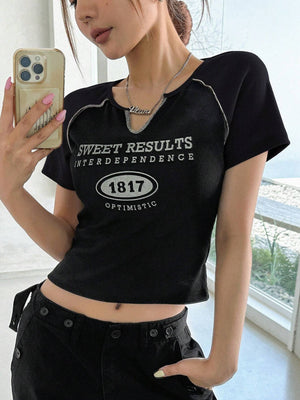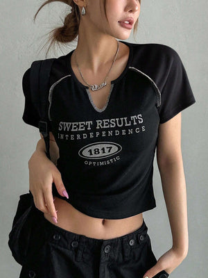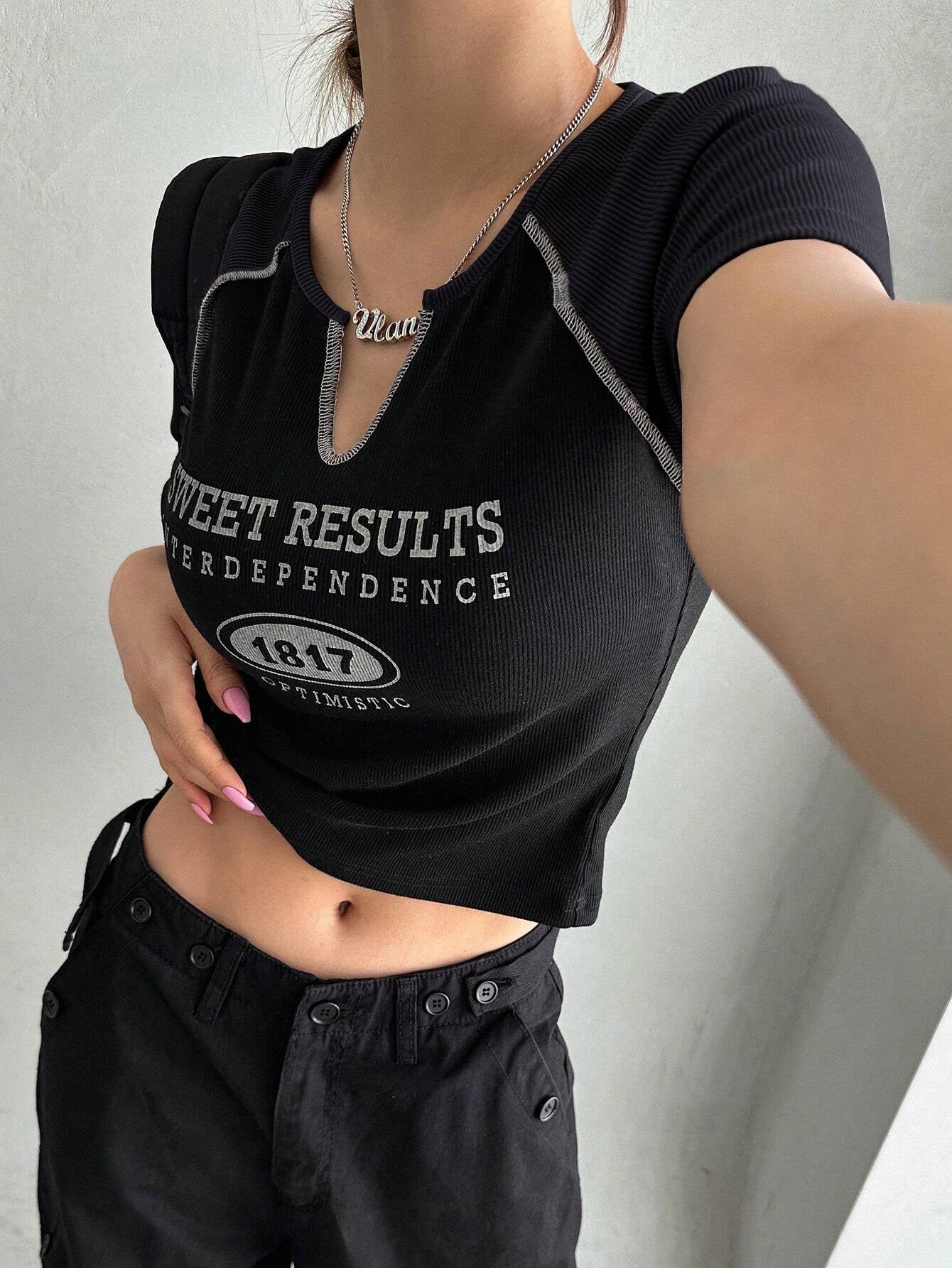 Slogan Print Short Sleeve T-Shirt Jersey, Crop Tops Women, Graphic Tees