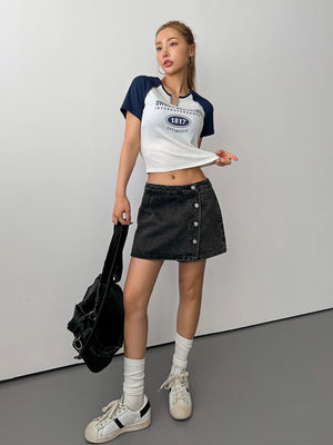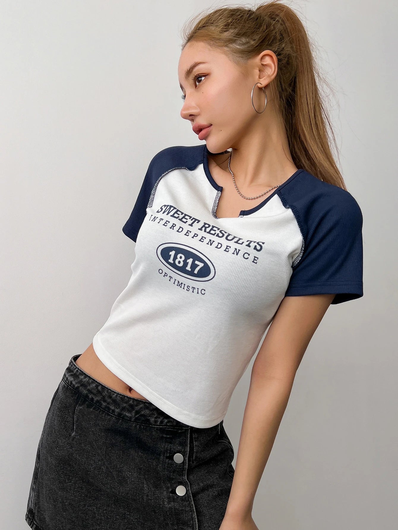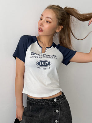 The unique notched neckline adds a distinctive touch while the trendy raglan sleeves create an athletic-inspired silhouette. Stylish rib-knit details and contrast binding elevate this piece from basic to statement-making, while the crop length pairs perfectly with high-waisted bottoms for modern, flattering proportions. The regular fit ensures comfortable movement throughout your day.