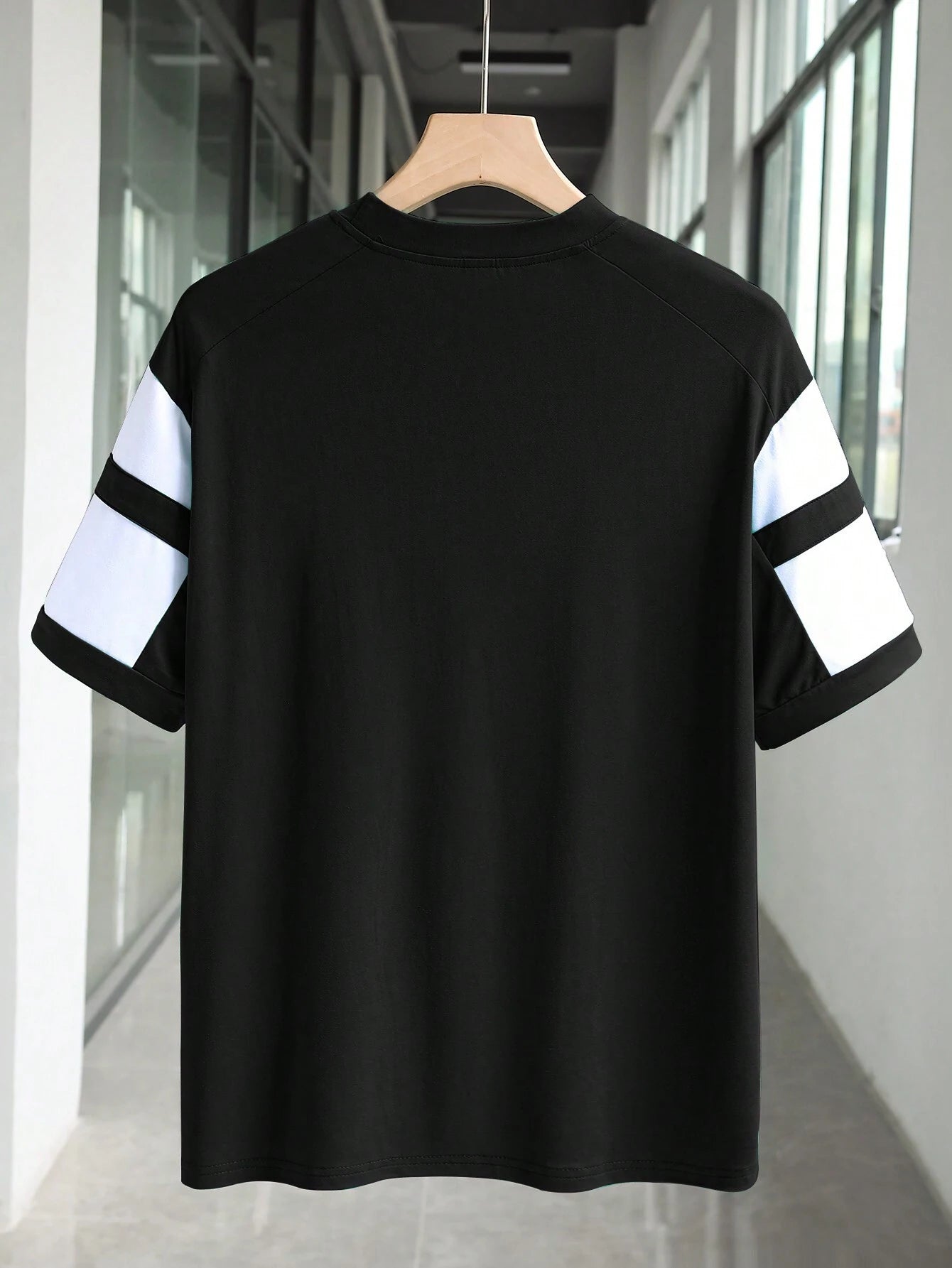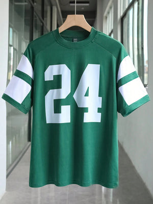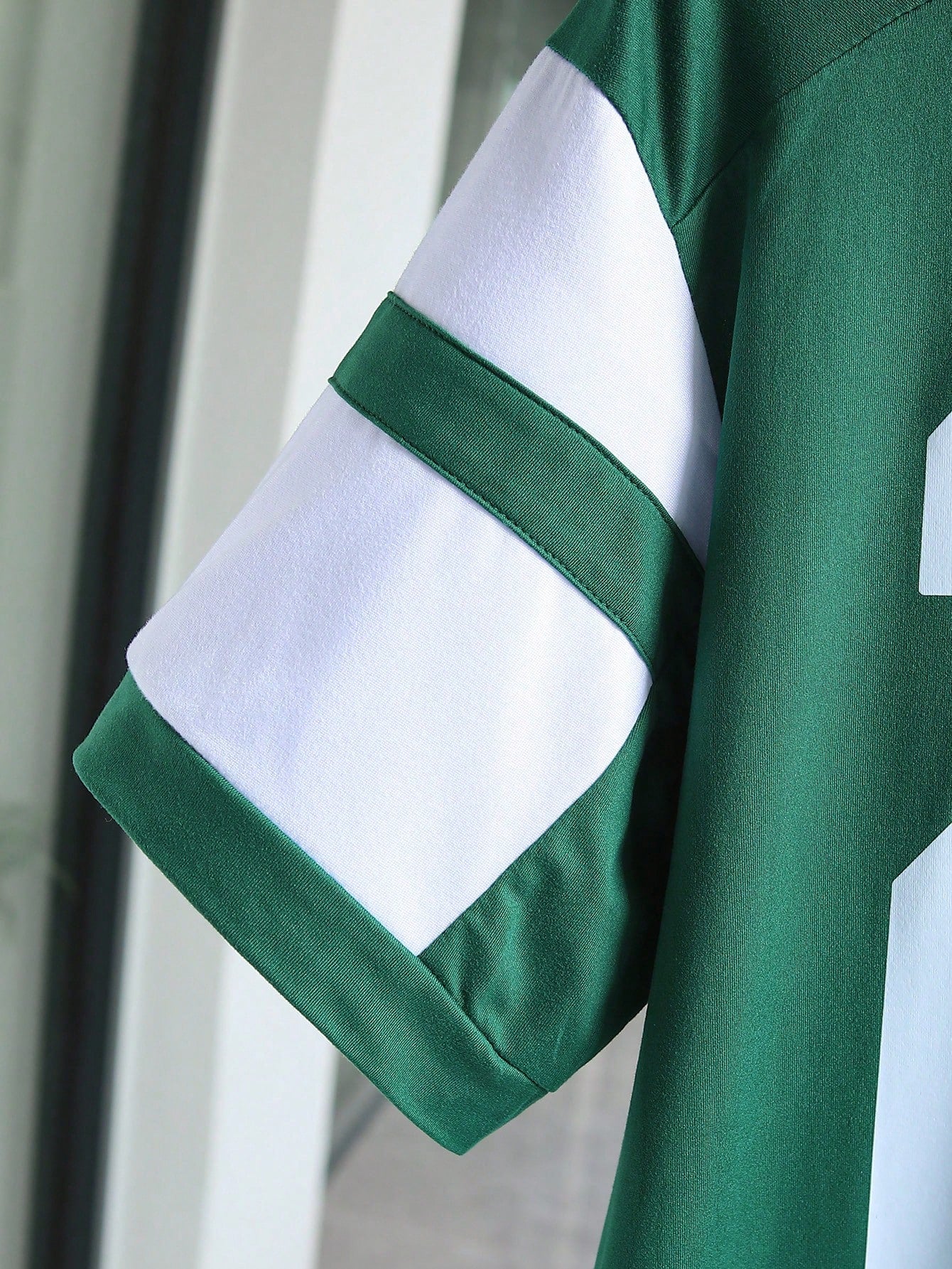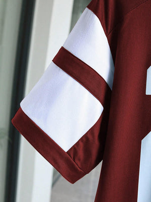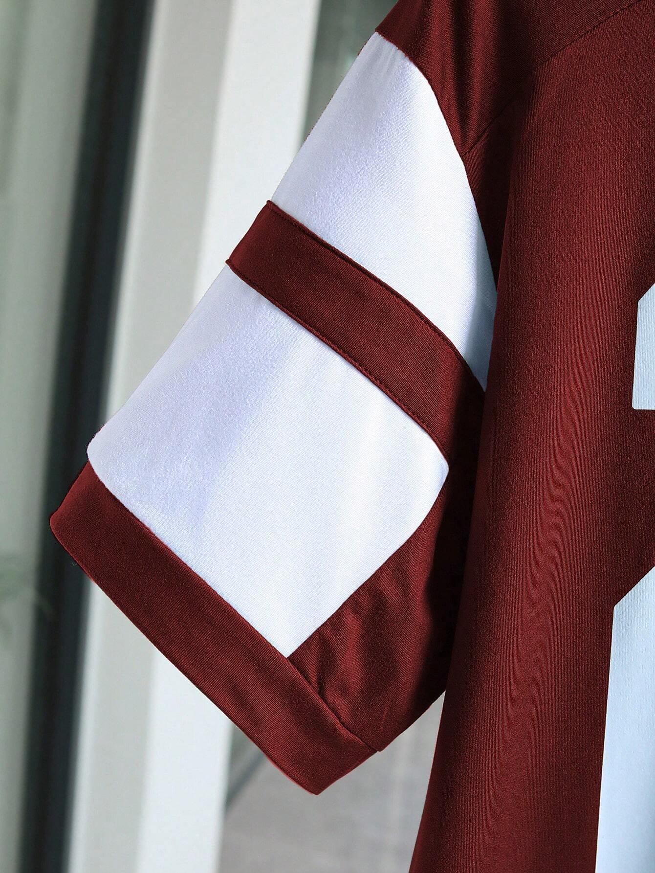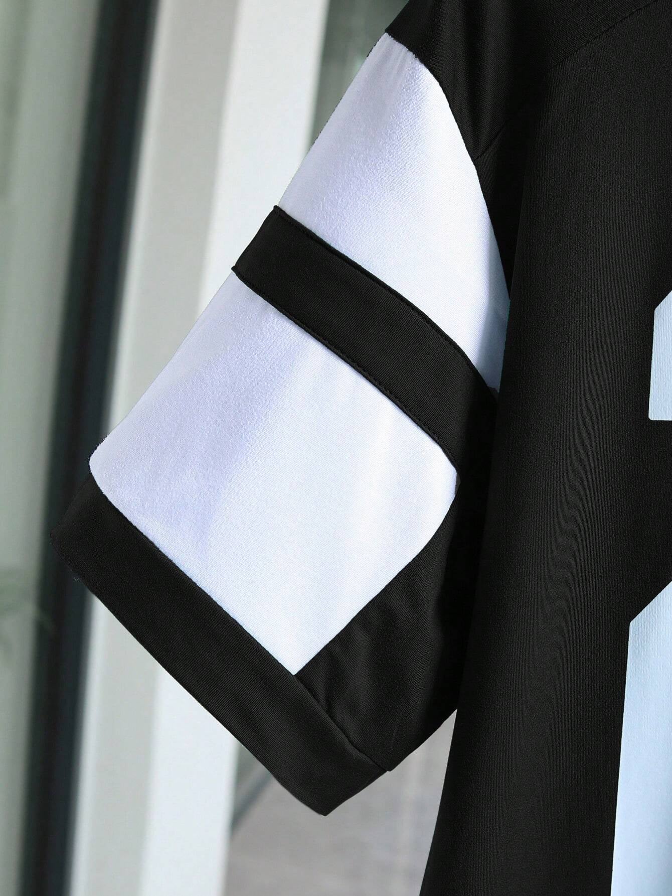 Solid Color Patchwork Crew Neck Short Sleeve Numeric Print Casual Top Graphic Tees