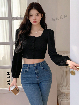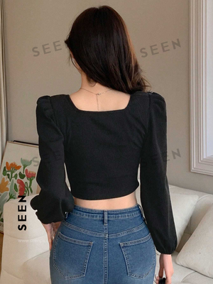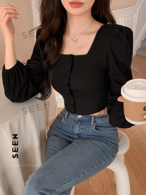 Enhance your wardrobe with our solid color short puff sleeve long sleeve t-shirt. Made with rib-knit fabric and a fitted design, this top offers a modern and sophisticated look. The bishop sleeves, square neck, and button front add luxurious details, making it perfect for any casual or formal occasion. Its medium stretch and knitted fabric provide comfort and style, while the black color adds a touch of elegance. Made from a blend of high-quality materials, including polyester, viscose, and elastane, this top is sure to become a staple in your wardrobe.