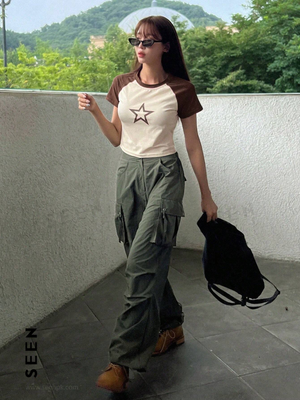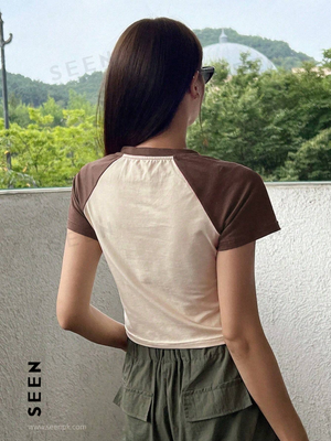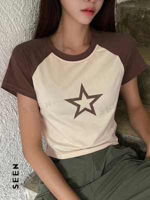 Introducing our Star Print Raglan Sleeve Crop Tee! This casual and trendy tee features a unique color block and geometric design, perfect for making a fashion statement. With a round neck and short raglan sleeves, this crop top is made of high-stretch fabric for a comfortable and regular fit. Made from 95% cotton and 5% elastane, it's easy to care for by machine washing or professional dry cleaning. Show off your style with our must-have crop tee.