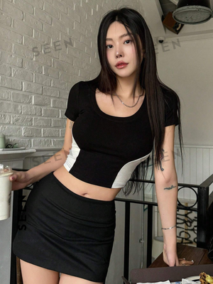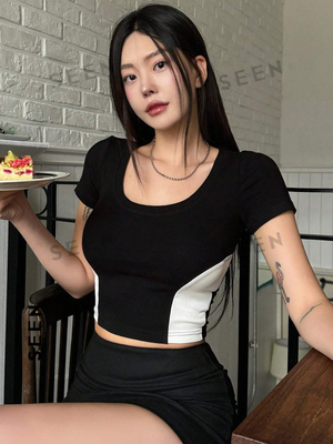 Embrace luxury with our Women's Color Block Round Neck Short Sleeve T-Shirt. The rib-knit design offers a slim fit and high stretch for a flattering silhouette. The black and white colorblock design exudes sophistication, while the scoop neck and short sleeve add a touch of casual comfort. Made with 92% viscose and 8% elastane for ultimate softness and comfort.