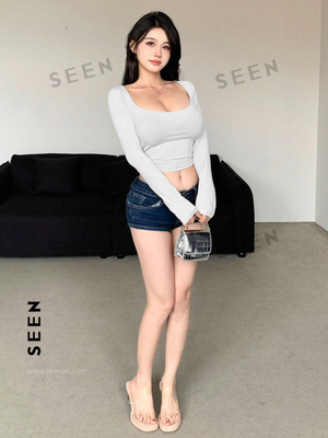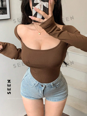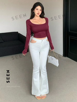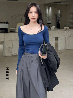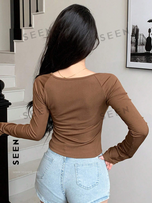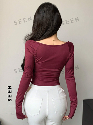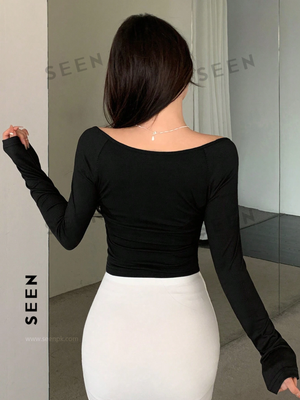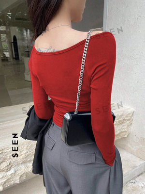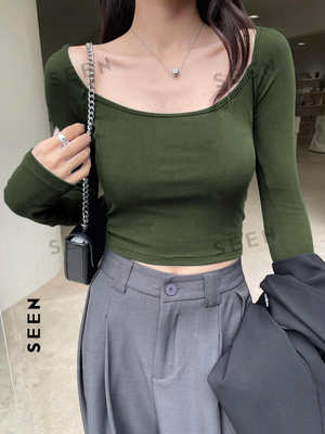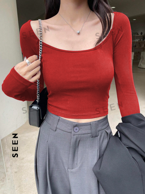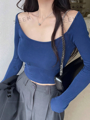 Women's Solid Color Square Neckline Long Sleeve Slim Fit T-Shirt