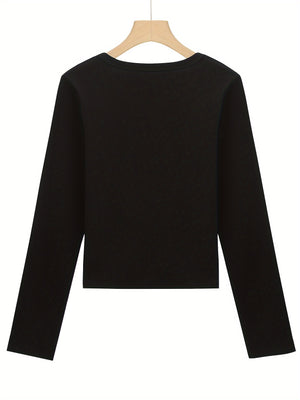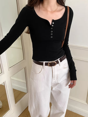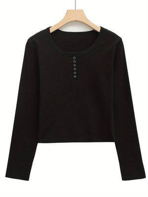 Black Long Sleeve Button-Up Round Neck T-Shirt