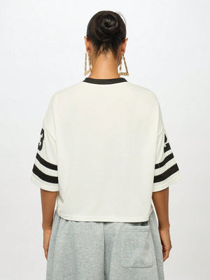 The classic round neckline and trendy drop shoulders create a relaxed, sporty silhouette, while the oversized fit ensures comfortable, unrestricted movement. Stylish contrast binding adds a polished varsity touch, and the combination of letter prints and striped details creates an authentic baseball jersey look. The regular length makes this versatile piece easy to style with high-waisted bottoms or layer over longer tees.