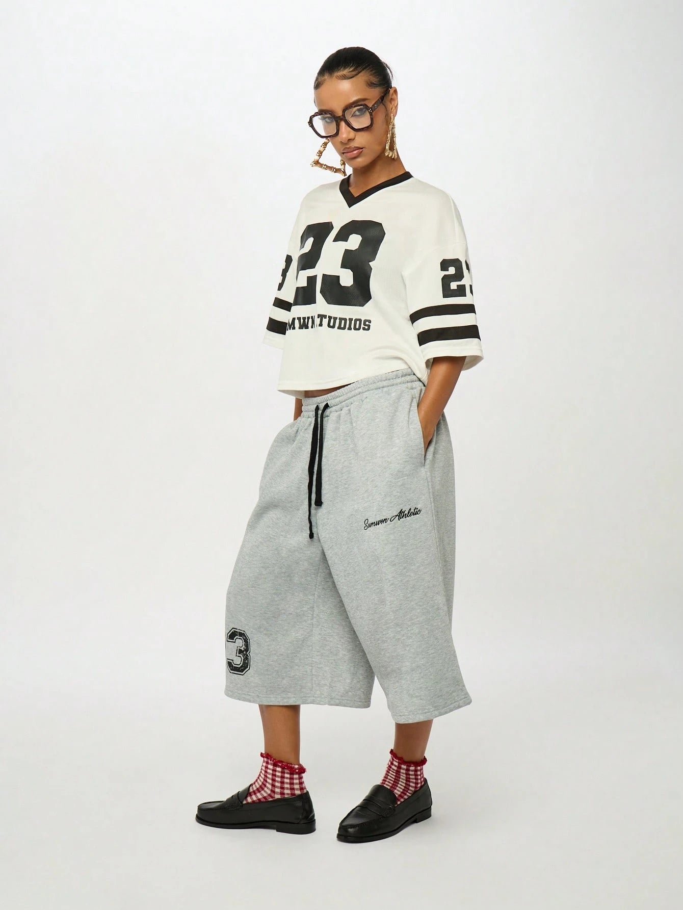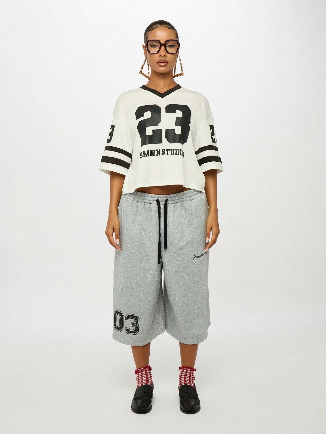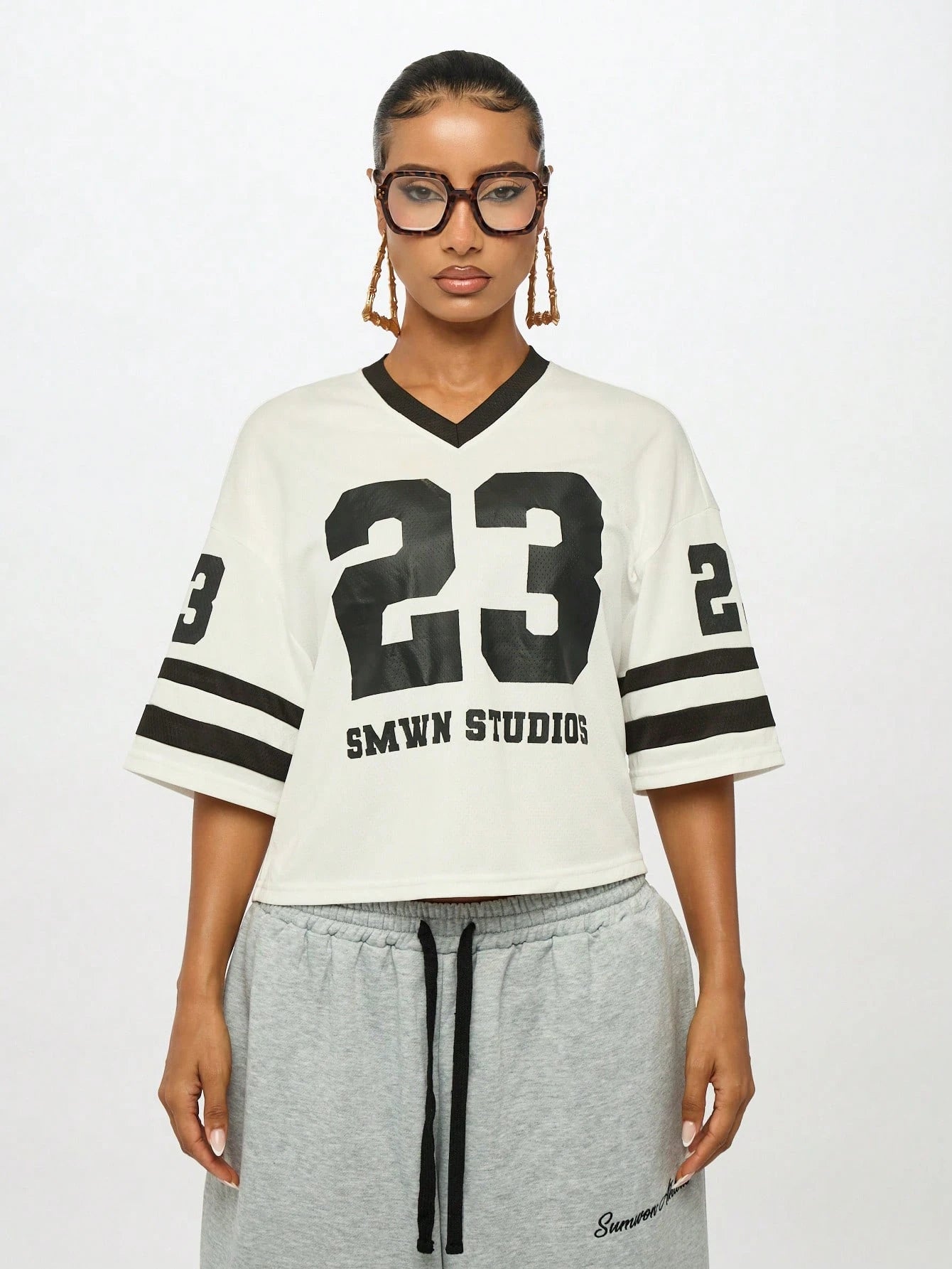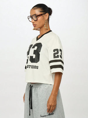 Channel authentic varsity vibes with this oversized baseball-inspired crop jersey that brings collegiate style to your everyday wardrobe. Featuring the iconic number 23 and SMWN Studios branding, this boxy-fit tee combines athletic aesthetics with contemporary streetwear appeal, perfect for school or casual outings.