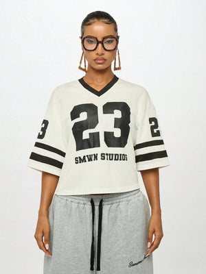 Boxy Fit Oversized Varsity Baseball Crop Jersey Number 23 SMWN Studios Collegiate Graphic Print Short Sleeve T-Shirt