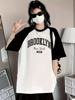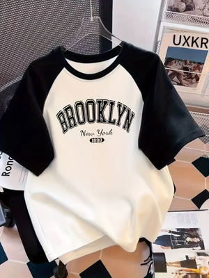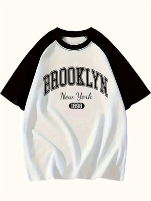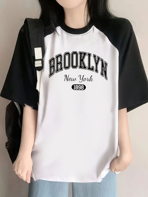This women's color-block raglan sleeve T-shirt, modern look. Featuring a Brooklyn New York 1989 letter print it offers comfort and effortless streetwear appeal. Made from smooth knit elastane fabric, this crew neck pullover is ideal for spring, summer, and fall casual wear. Its soft texture and short raglan sleeves provide ease of movement, while the color-block design adds a contemporary edge. Hand wash recommended to maintain quality and shape.