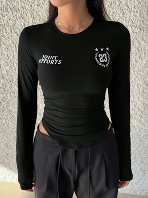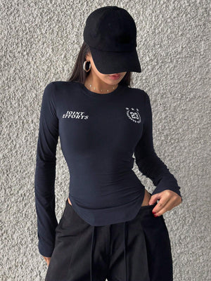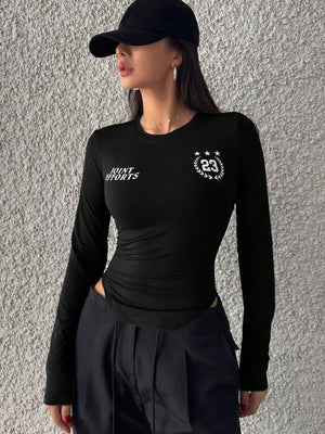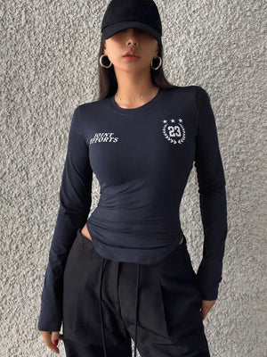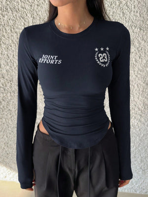 Get ready for school spirit with this playful Campus Back To School Sports Jersey! Featuring a comfy round neck and regular fit, its navy blue knitted fabric keeps you cozy whether you're at home or on the go. The colorblock, geometric, and letter patterns add a fun, sporty vibe, while the asymmetrical ruching and curved hem bring a unique twist to your casual look. Perfect for showing off your style with a splash of energy!