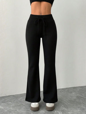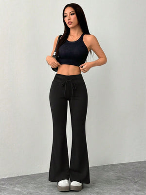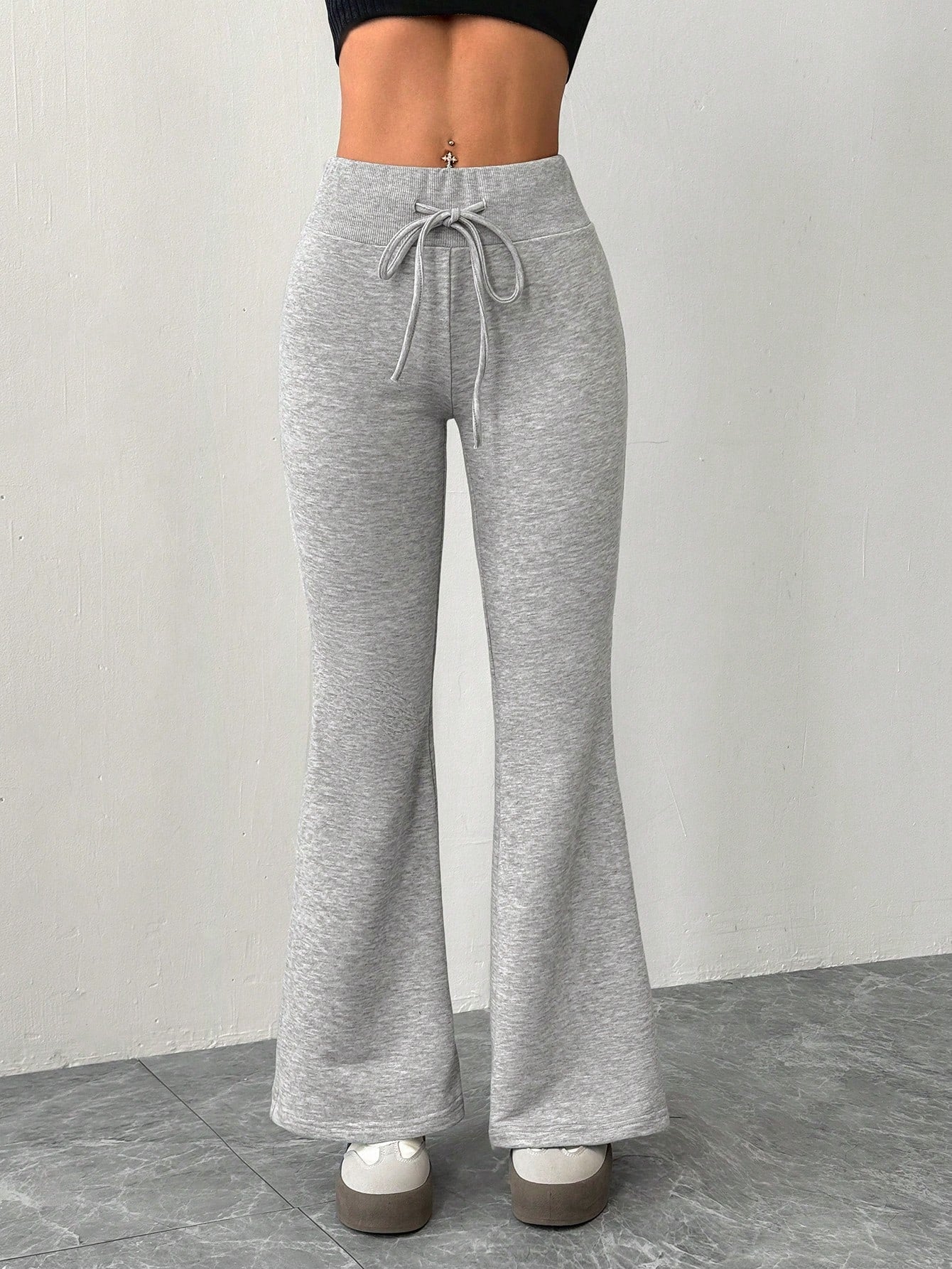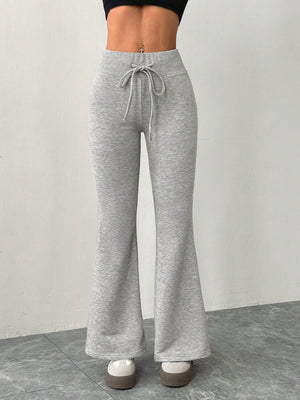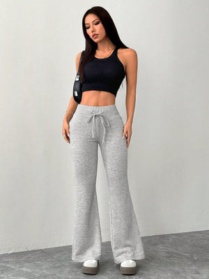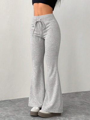 Casual Gray Knitted Elastic Waist Flared Sweatpants Bell Bottom Lace Up Flared Pants