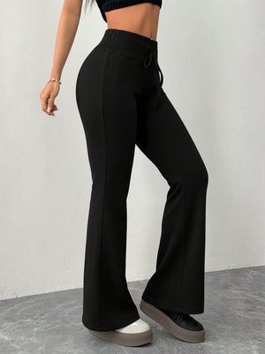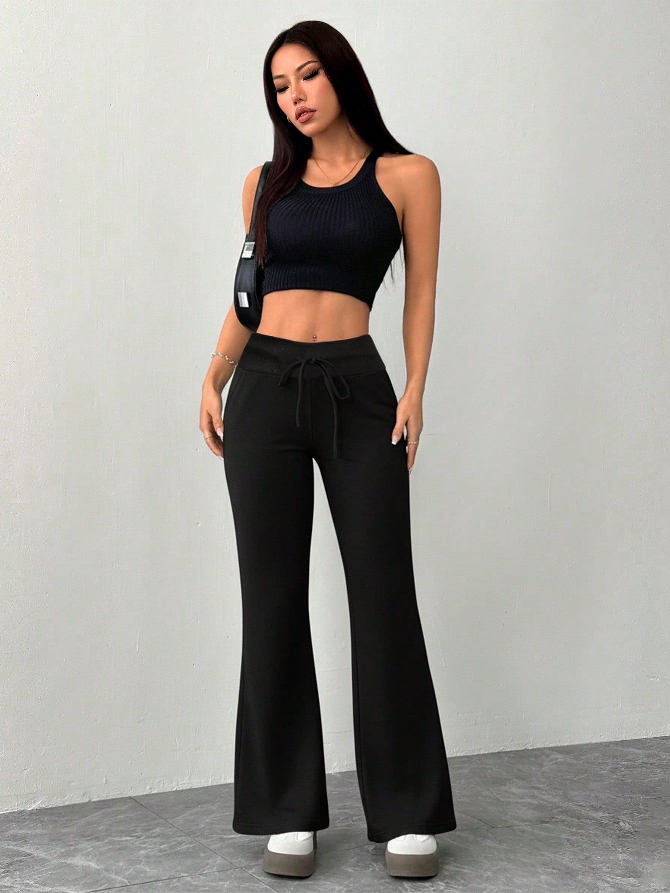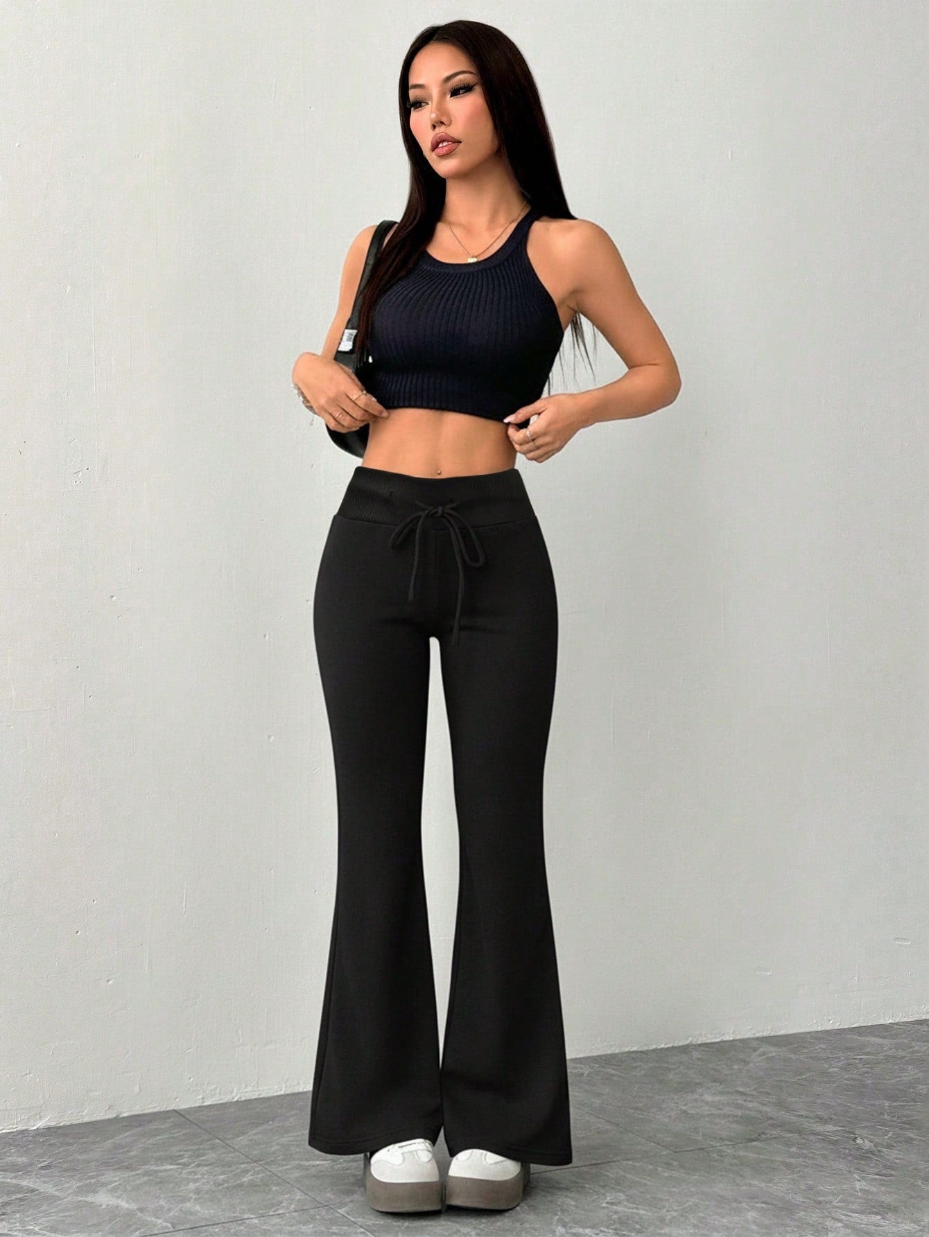 The natural mid-waist design with convenient drawstring closure ensures a customizable fit, while the skinny fit through the thigh transitions beautifully into the dramatic flare at the hem. Stylish knot details add a unique touch to these casual essentials, making them perfect for spring and fall weather (18-25°C/63-77°F).