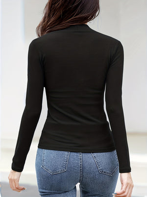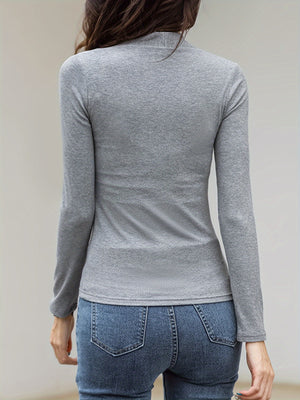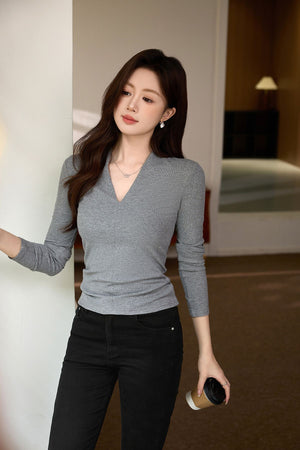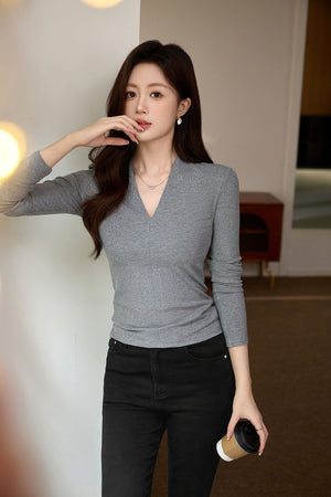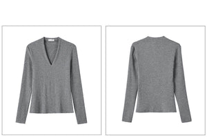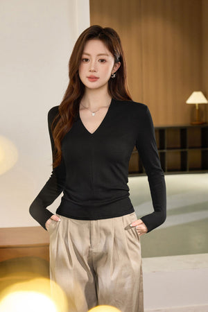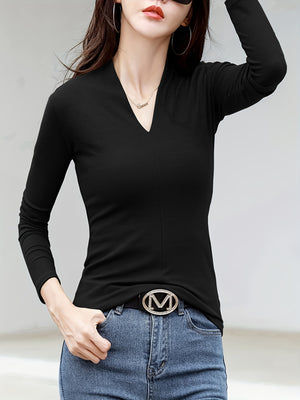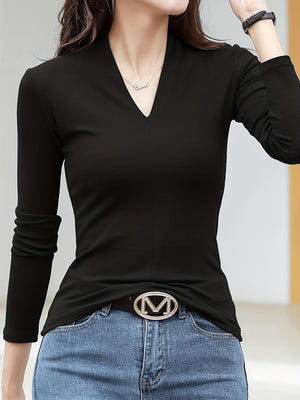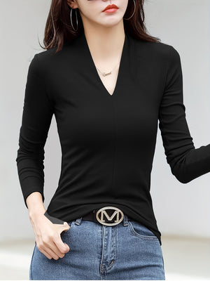 Casual Long Sleeve T-Shirt - Deep V-Neck Semi-Sheer Top