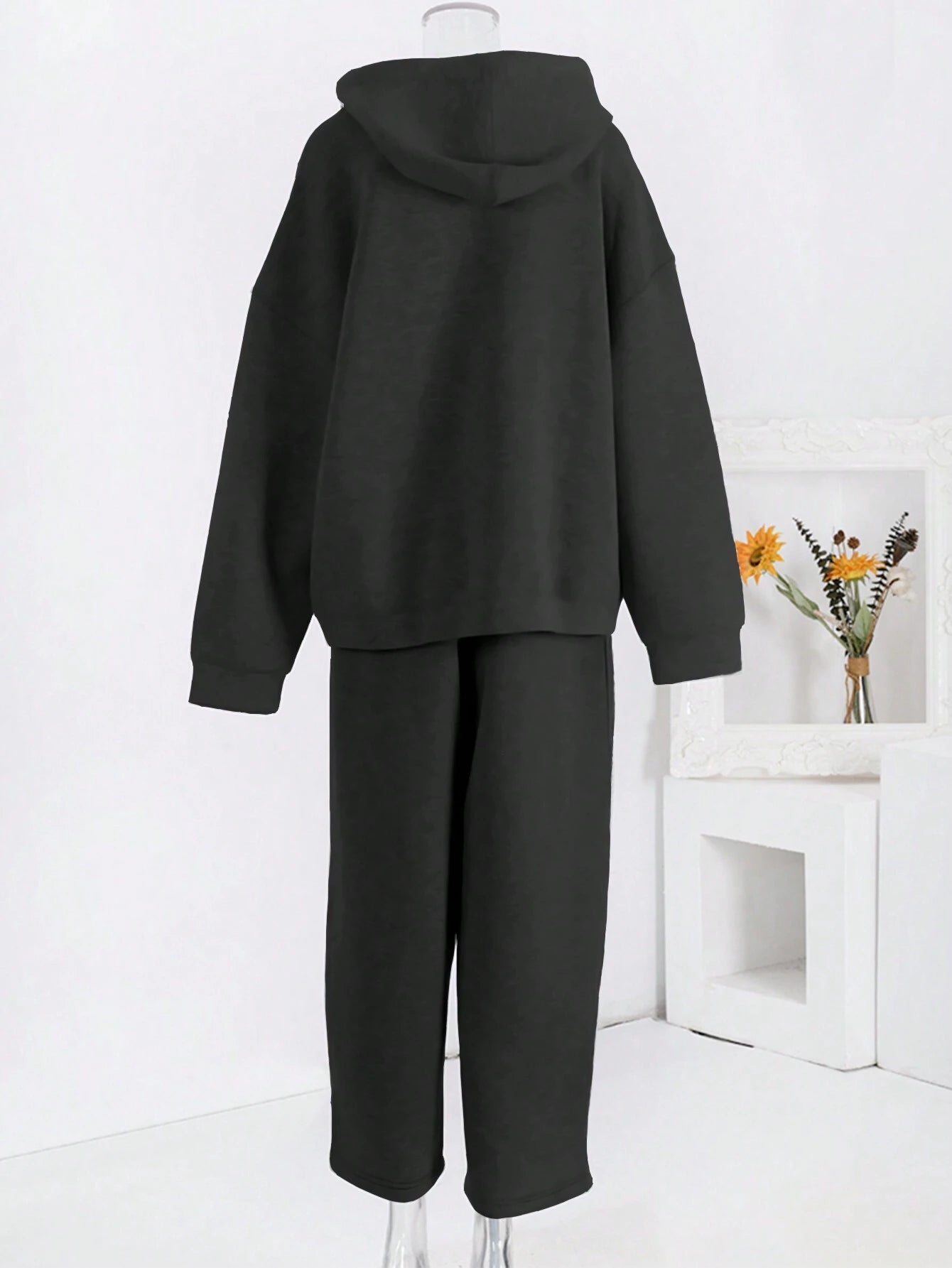 The hooded sweatshirt features a convenient drawstring hood for adjustable coverage, while the matching sweatpants complete the look with their comfortable fit and coordinated styling. Whether you're lounging at home, running errands, or enjoying casual outings, this set delivers all-day comfort without compromising on style.