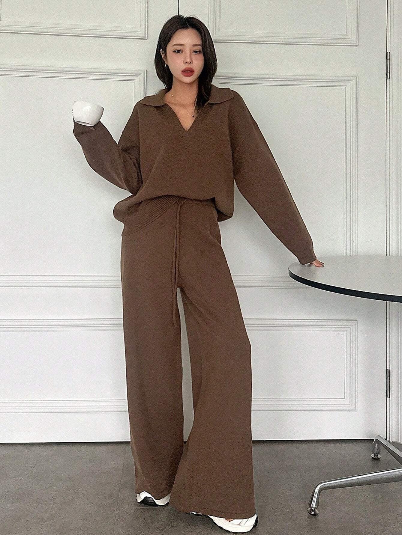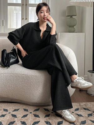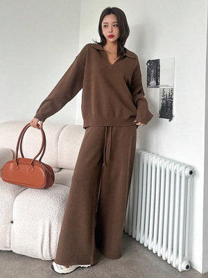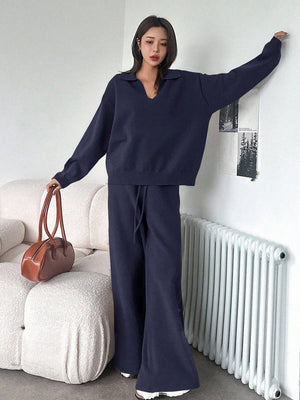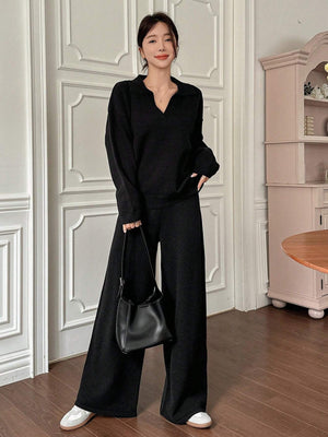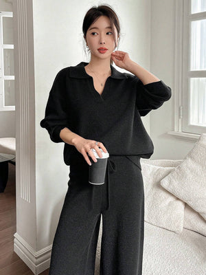 Home Casual Solid Color Turndown Collar Loose Sweater And Wide Leg Pants 2 Pieces Set