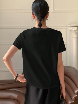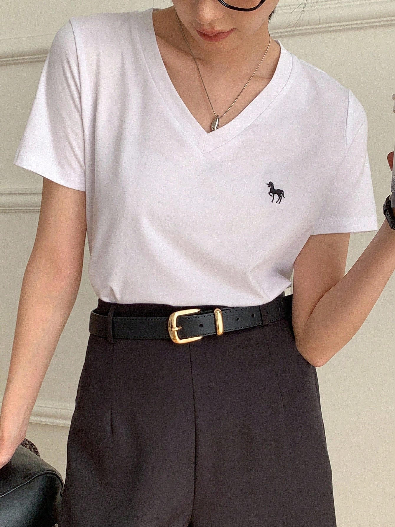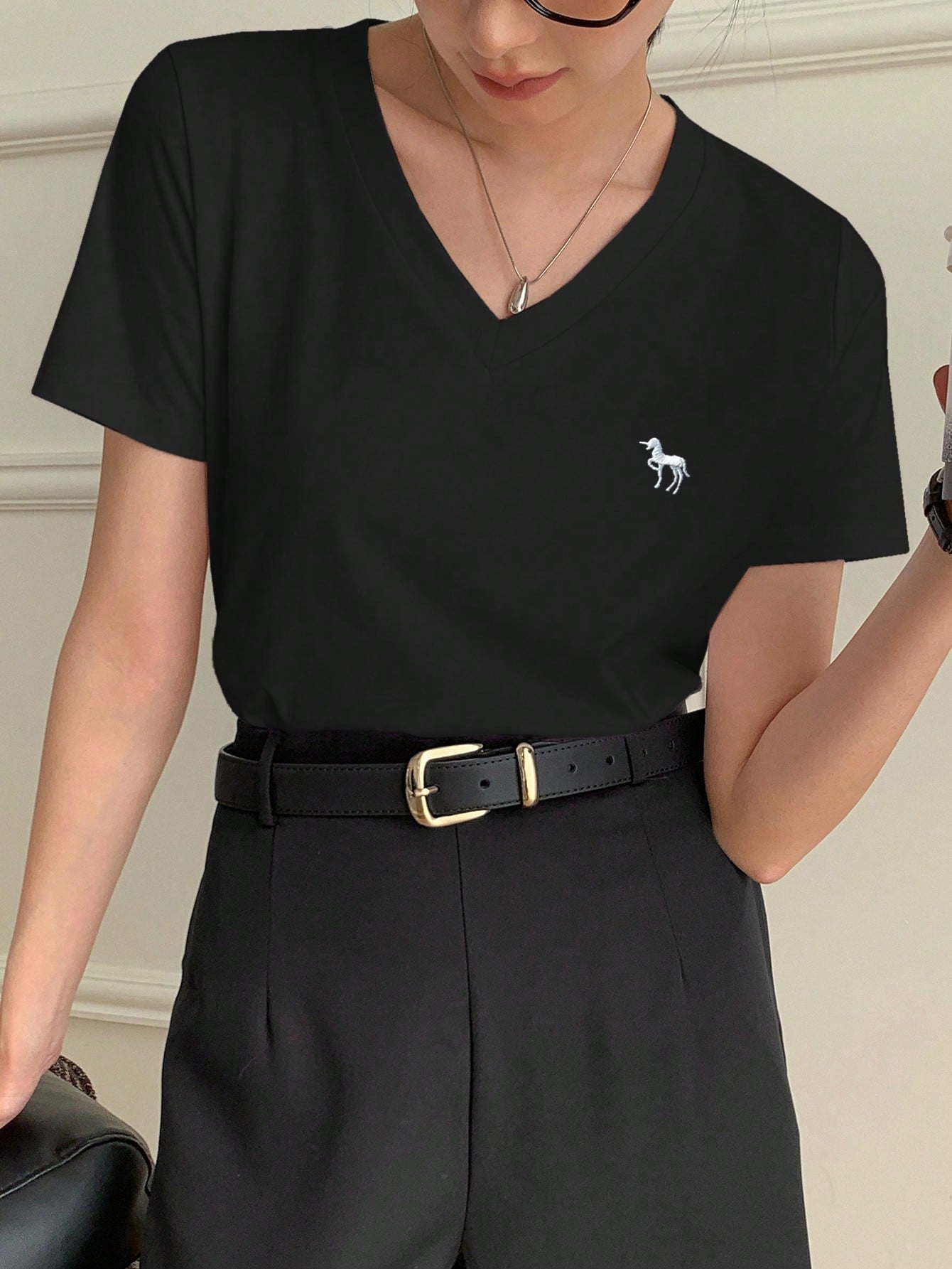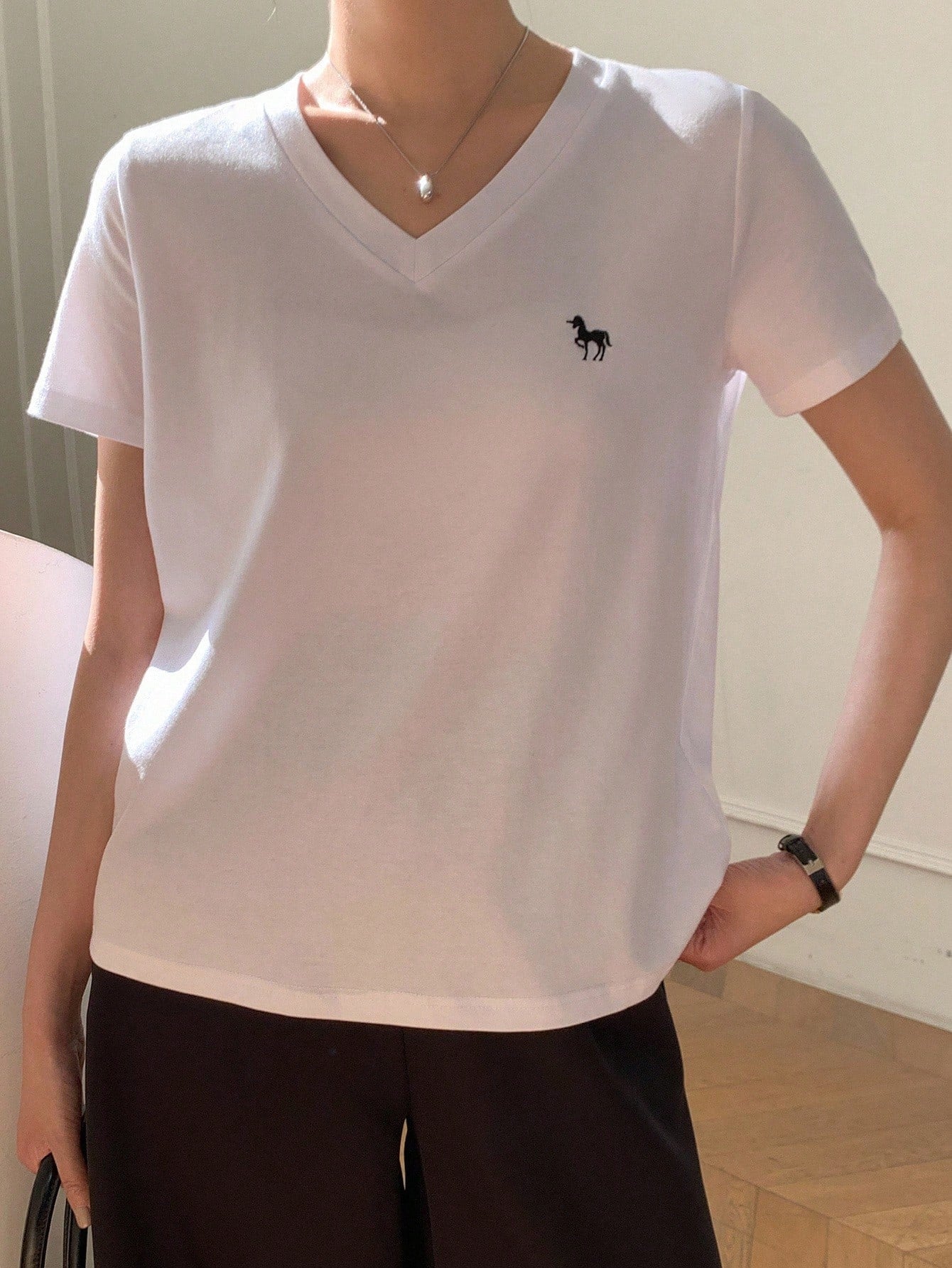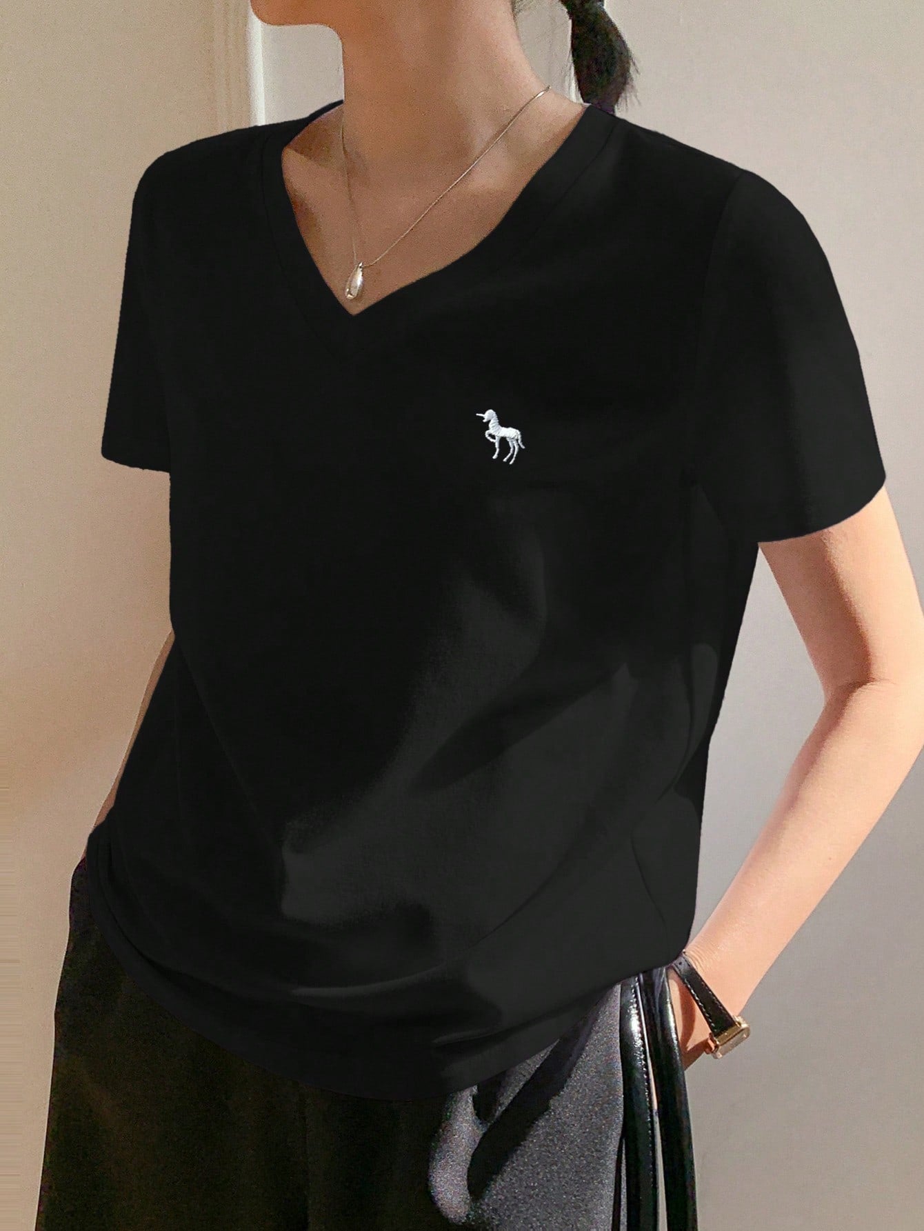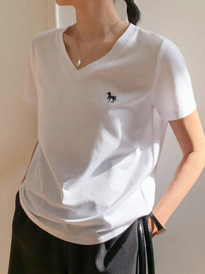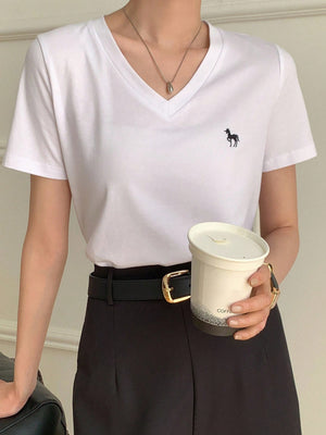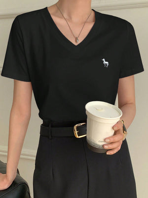 Casual V-Neck Unicorn Embroidery Short Sleeve T-Shirt
