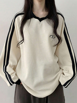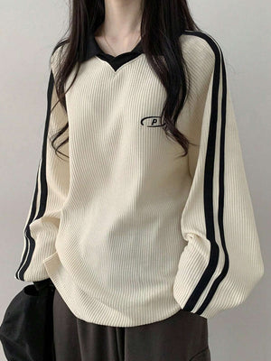 Contrast Color Block Striped Long Sleeve Casual Letter Print Sweatshirt, Collegiate Style, Long Sleeve Tops