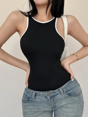 This slim-fit bodysuit features a sleek round neckline and sleeveless tank design, crafted with rib-knit fabric for comfortable stretch. Its contrast color trim and colorblock pattern add a modern edge, making it ideal for daily wear, sports, or workouts. The natural mid-waistline enhances your silhouette, combining style and functionality in a casual yet sexy form-fitting piece.