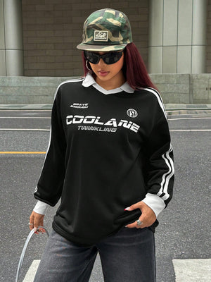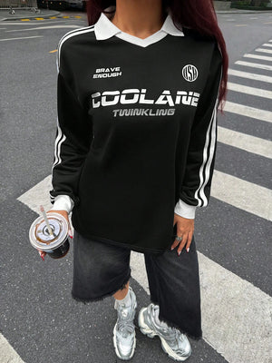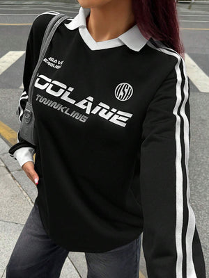Embrace the cooler seasons in style with this versatile sport sweatshirt that effortlessly transitions from casual home comfort to going-out confidence. The distinctive banded texture decoration and colorblock design with letter and striped details create a sporty-chic aesthetic that stands out from ordinary sweatshirts.