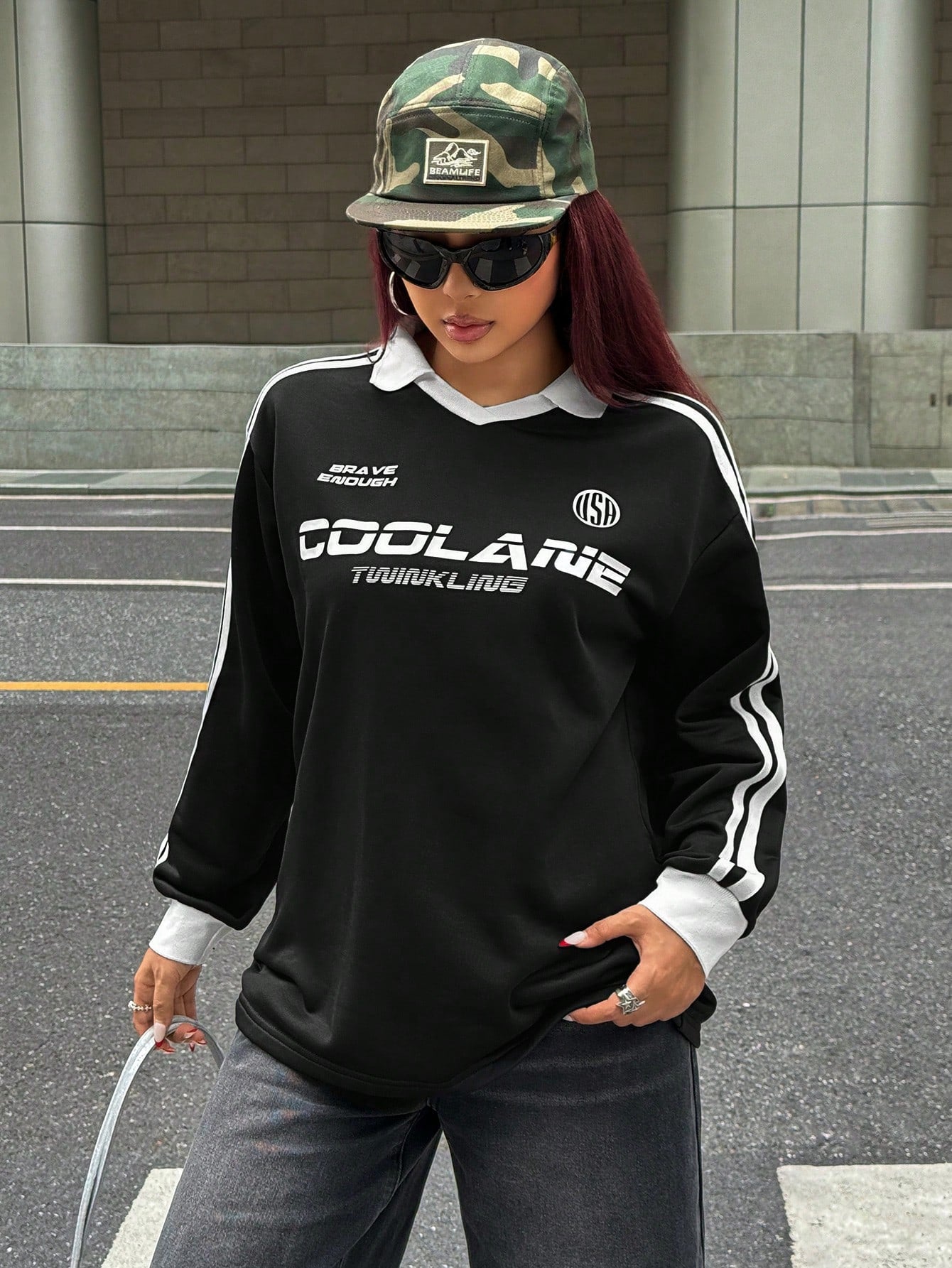 Crafted as a pullover with a flattering V-neck collar, this sweatshirt features rib-knit and tape detailing that adds dimension and visual interest. The loose, baggy fit ensures maximum comfort while maintaining a fashion-forward silhouette that's perfect for fall and winter layering.