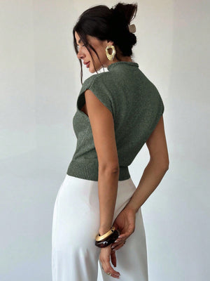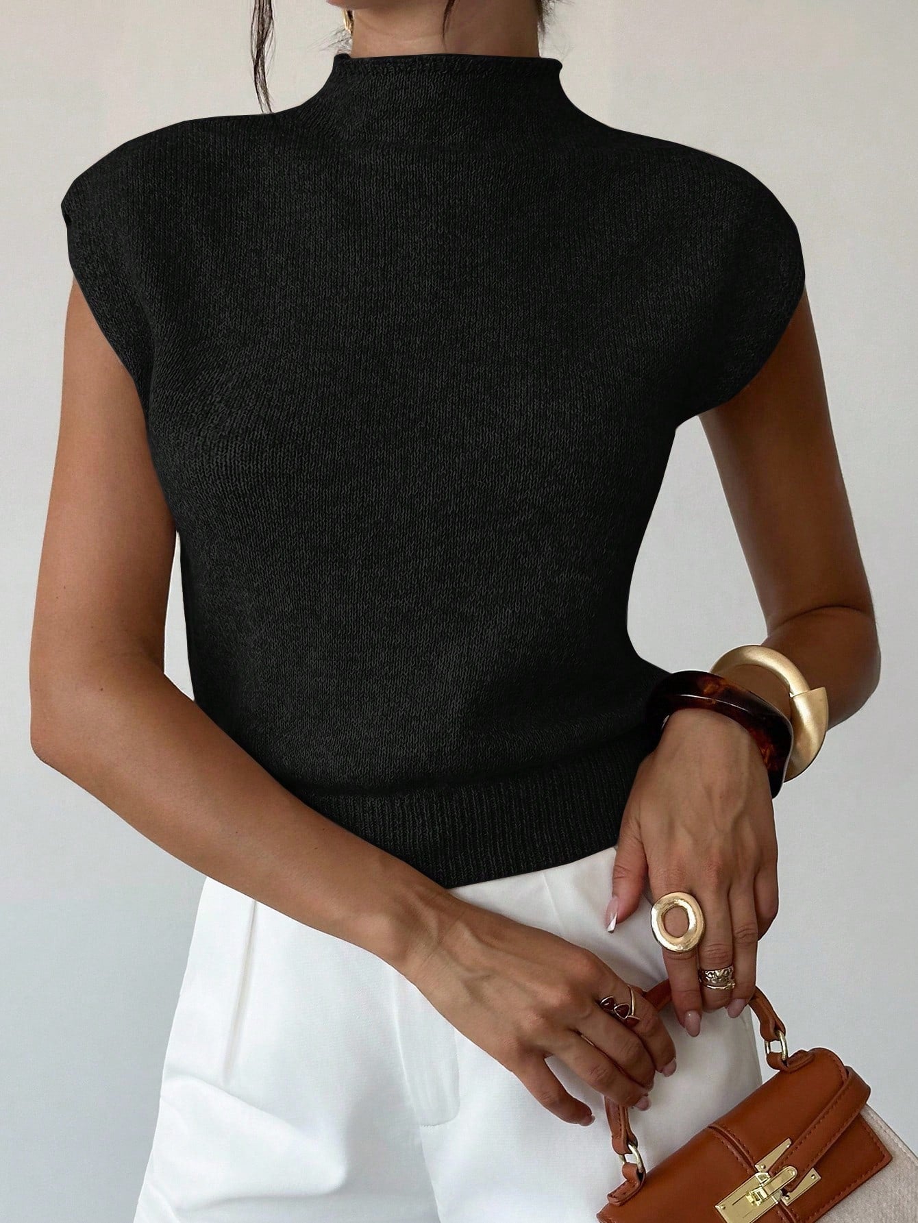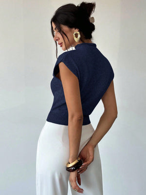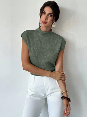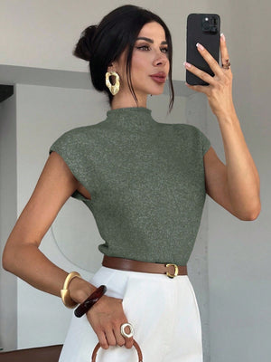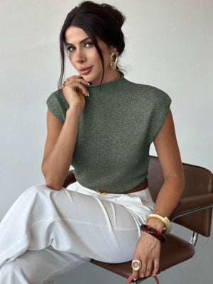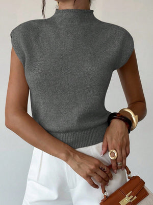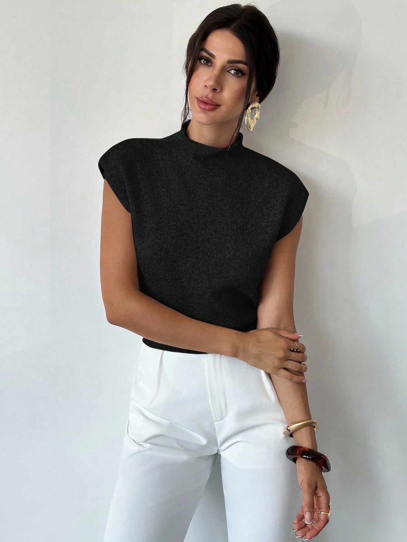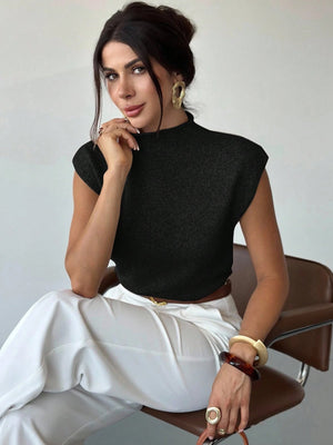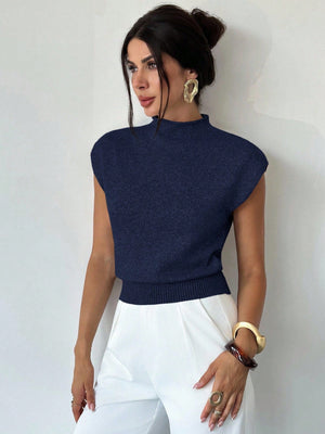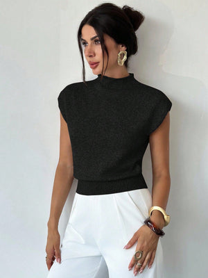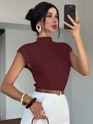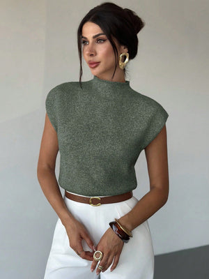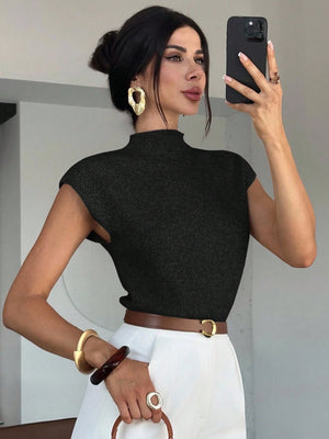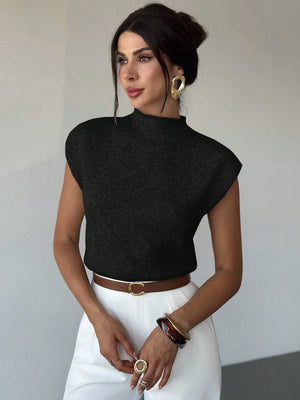 Discover effortless elegance with this high neck sleeveless knit sweater featuring a unique batwing sleeve design and textured finish. The versatile style transitions seamlessly from casual to formal occasions, making it a must-have wardrobe essential.