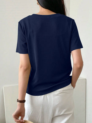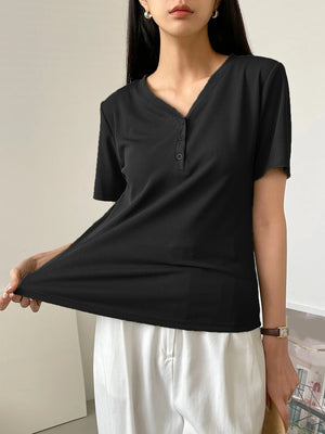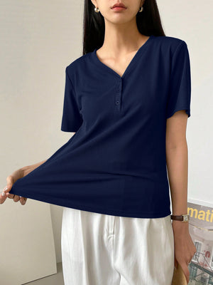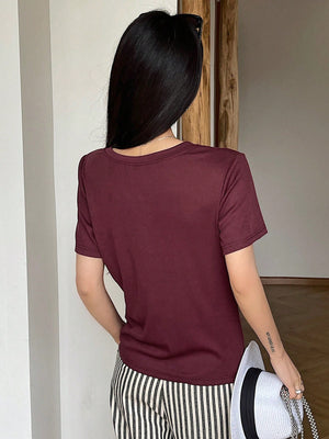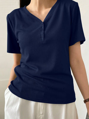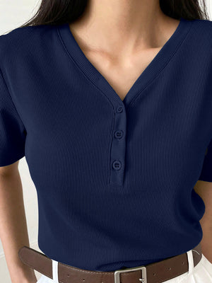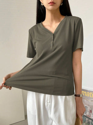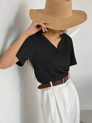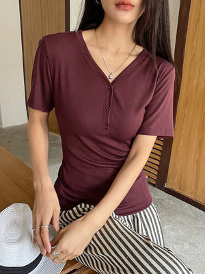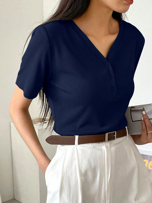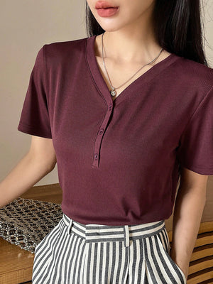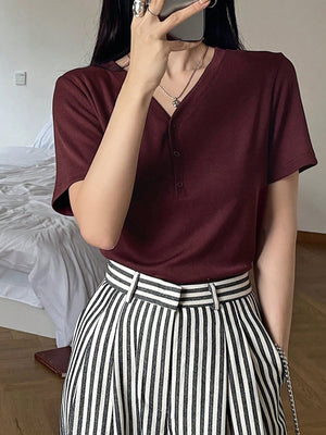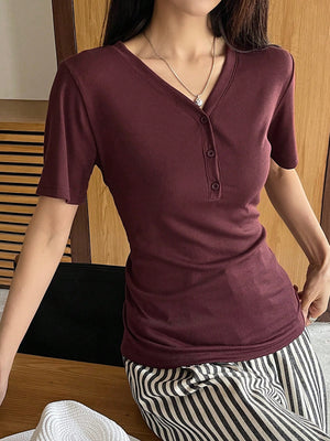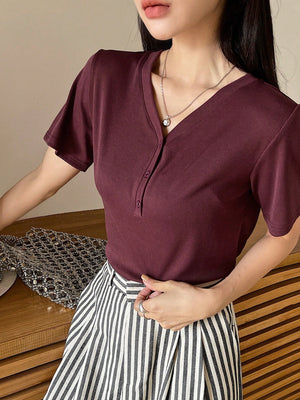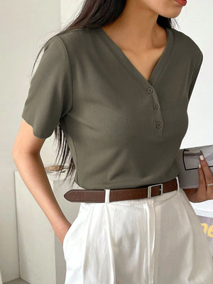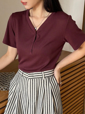 Step into timeless charm with our Less Solid Rib Knit Button Front Tee, inspired by old money style. Featuring a playful V-neck and classic button details, this casual tee offers a regular fit with short sleeves and a comfortable rib-knit texture. Its plain pattern and regular hem make it effortlessly stylish for everyday wear. Perfect for those who love a subtle nod to vintage elegance with a modern twist.