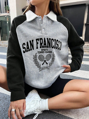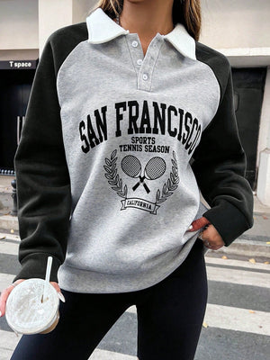 Make a bold statement with this letter graphic sweatshirt featuring a stylish contrast collar and raglan sleeves. The polo neck design with button front closure adds a sophisticated touch to this casual essential, perfect for everyday wear.