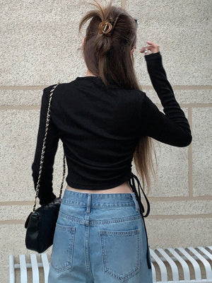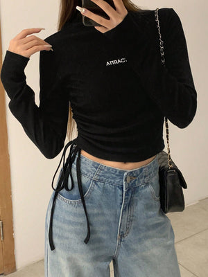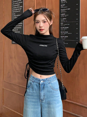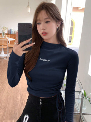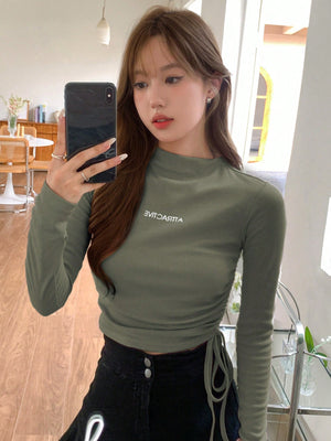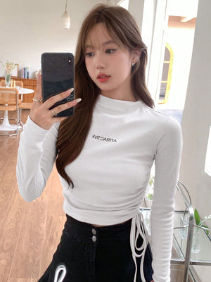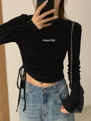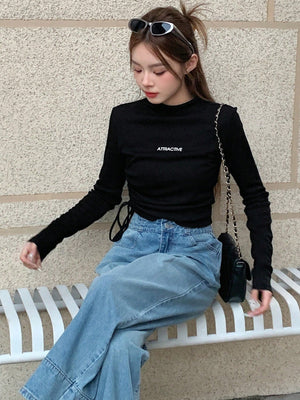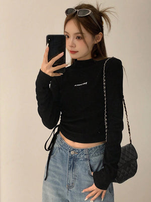 This slim-fit, cropped tee features a stand collar with a drawstring and ruched detailing on the sides, crafted from medium-stretch rib knit fabric for comfortable wear. Its long, regular sleeves and letter graphic pattern add casual style, making it ideal for relaxed home settings. The mock neck design and regular hem complete this versatile piece.