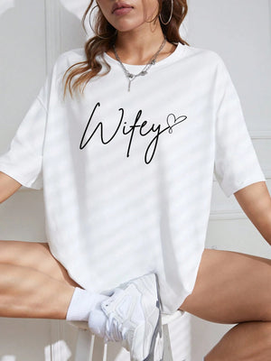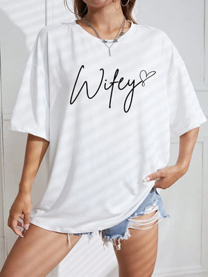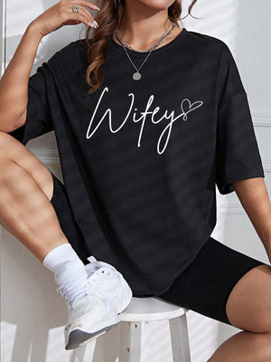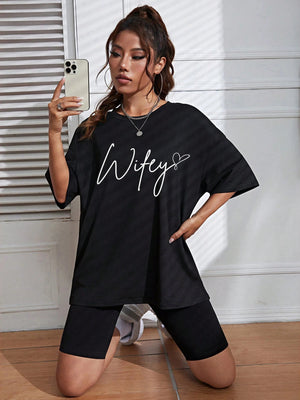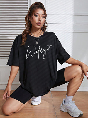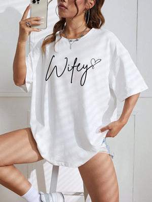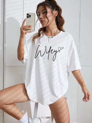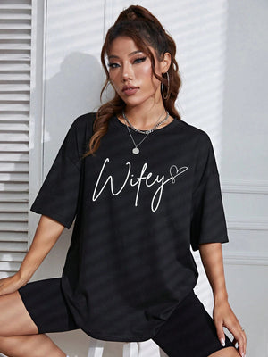 This oversized Letter Graphic Drop Shoulder Tee combines comfort and style with its long length and casual design. Featuring a round neckline, half sleeves, and a regular hem, this top showcases heart and letter patterns for a unique graphic appeal. Perfect for relaxed home wear, its drop shoulder silhouette ensures an effortless, laid-back fit while maintaining a modern edge.