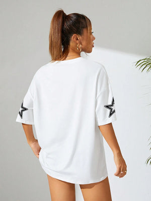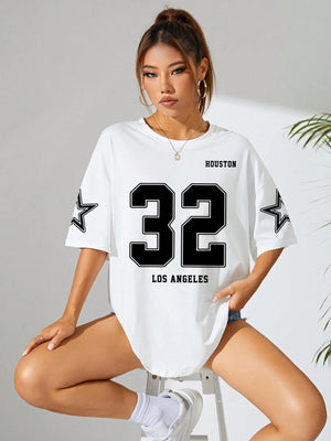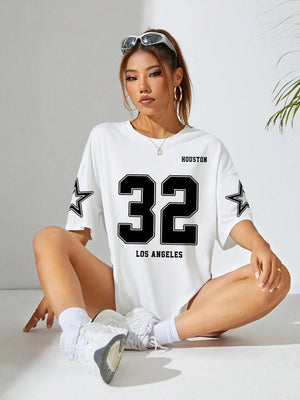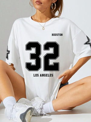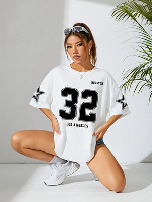 Letter & Number Pattern Drop Shoulder Short Sleeve T-Shirt Graphic Tees Women Tops