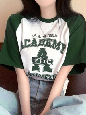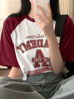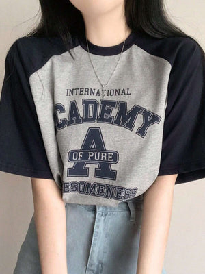 Letter Printed Round Neck Color Block Oversized Short Sleeve T-Shirt