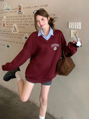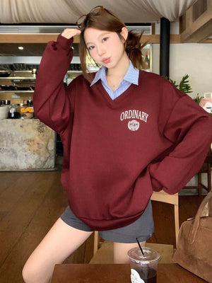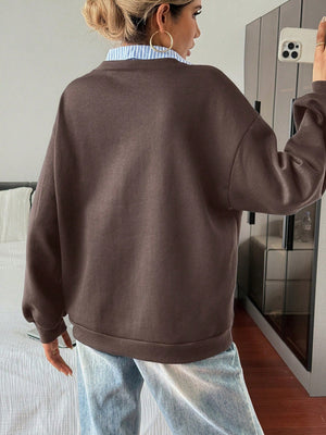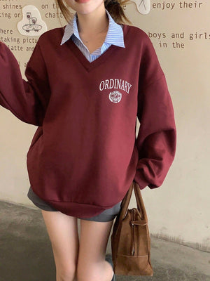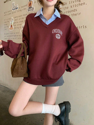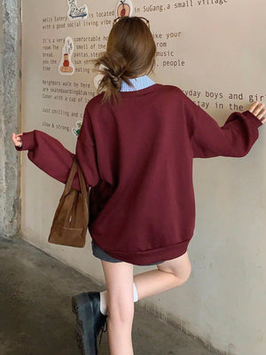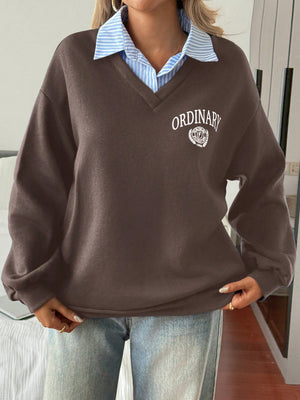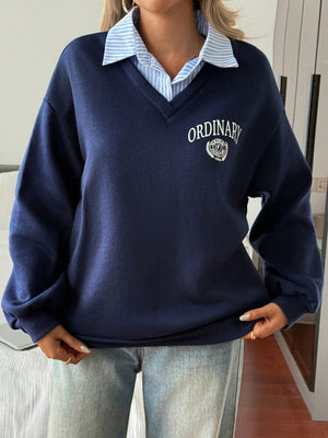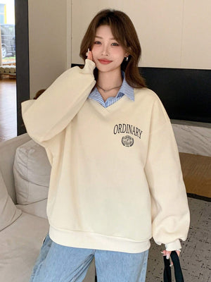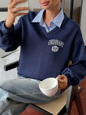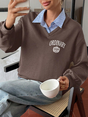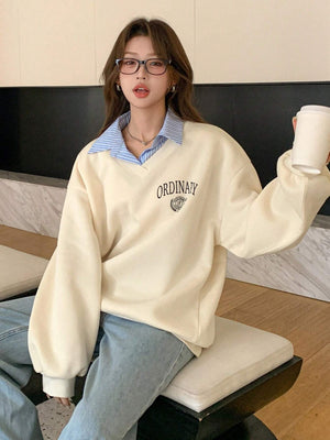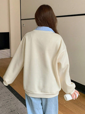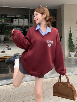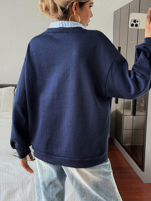 Stay warm and stylish with this unique letter and stripe print patchwork sweatshirt featuring thermal lining for extra comfort. The drop shoulder design with contrast collar creates a trendy, oversized look perfect for cooler days.