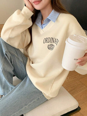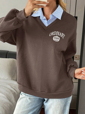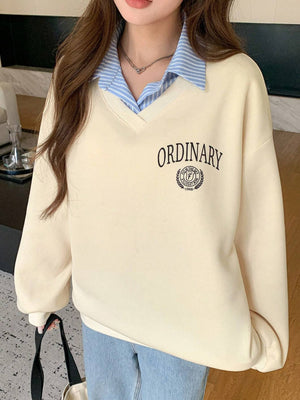 Letter & Stripe Print Patchwork Thermal Lined Sweatshirt