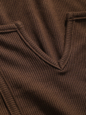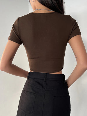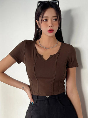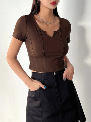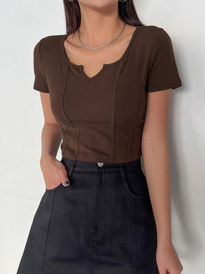 This coffee brown tee brings casual beach vibes with a playful twist. Featuring a notched neckline and asymmetrical hem, its rib-knit fabric offers high stretch for a slim, comfy fit. Short regular sleeves and a cropped length make it perfect for sunny days and relaxed outings.