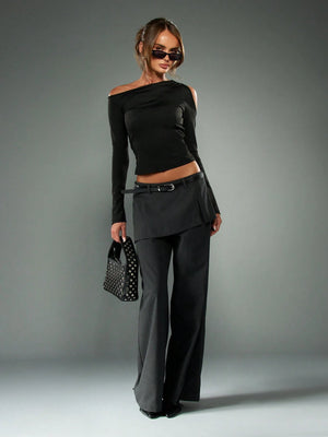 This slim fit black crop top features an asymmetrical neckline and cold shoulder long sleeves, delivering a modern edge perfect for fall and winter evenings. The cutout details and zipper add a unique flair, while the regular length and fitted silhouette ensure a flattering shape. Ideal for casual night outs, this shirt combines style and comfort effortlessly.