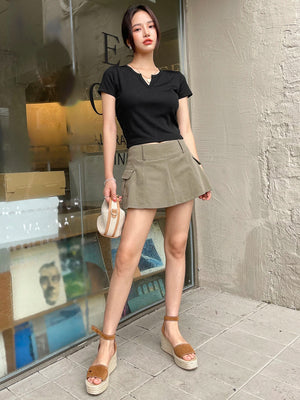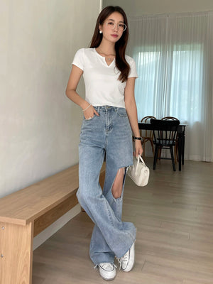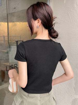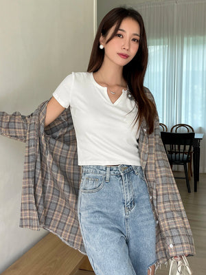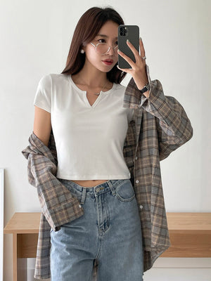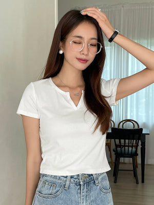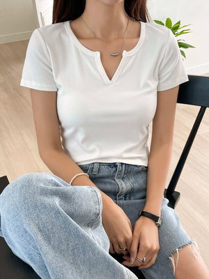 This Ribbed Knit Notched Neck Tee offers a comfortable regular fit with medium stretch fabric, ensuring ease of movement throughout your day. Featuring a casual crop length and short regular sleeves, its plain white rib-knit design and notched neckline add subtle style to your daily wardrobe. Ideal for everyday wear, this tee combines simplicity with a refined texture for versatile, effortless looks.