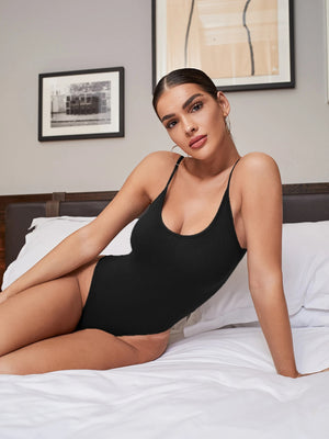 This Ribbed Open-Back Cami Bodysuit features a sleek spaghetti strap neckline and a natural mid-waist fit that enhances your silhouette. Crafted from rib-knit fabric, it offers a comfortable yet form-fitting wear. The backless design adds a bold, sexy edge, while the plain pattern ensures versatile styling options. Sleeveless and slim-fitting, this bodysuit is ideal for layering or wearing alone to create a confident, modern look.