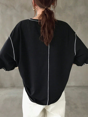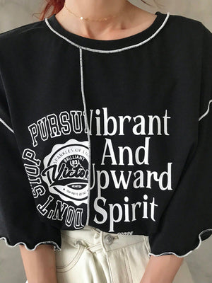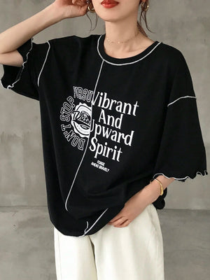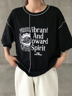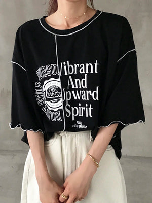 This oversized graphic tee features a comfortable loose fit with a round neckline and drop shoulder short sleeves for relaxed wear. Crafted with contrast binding and a distinctive ruffle hem, it adds subtle style to casual home outfits. The letter and striped pattern combined with contrast colors, enhance its summer-ready appeal, making it both breathable and effortlessly stylish for everyday comfort.
