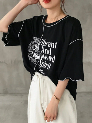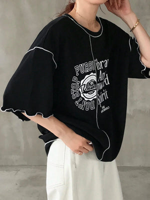 Round Neck Contrast Color Ruffle Hem Loose Fit T-Shirt With Contrast Letter Print, Summer Oversized Graphic Tee