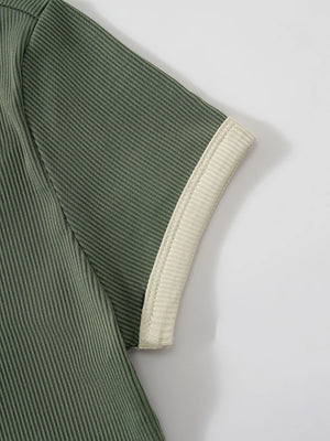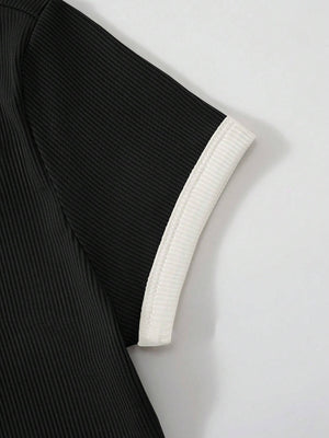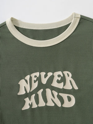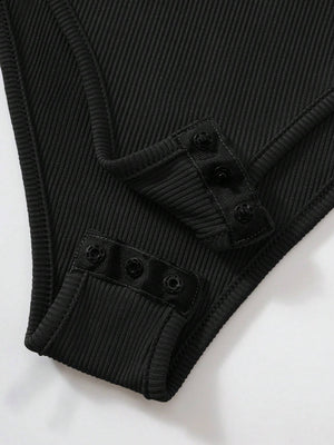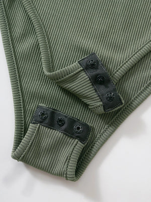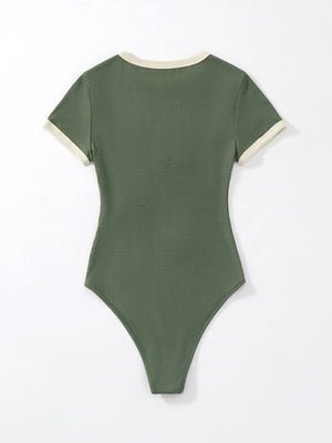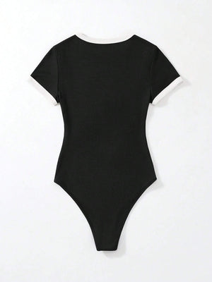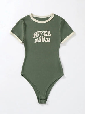 The Slogan Graphic Contrast Binding Bodysuit features a round neckline and regular short sleeves, crafted from medium-stretch knitted fabric for comfortable wear. Its natural mid-waist fit and rib-knit texture are enhanced by contrast binding and piping details, adding subtle visual interest. Designed as a casual tee-style bodysuit in dusty blue, it offers a regular fit that balances style and ease, making it a versatile addition to your wardrobe.
