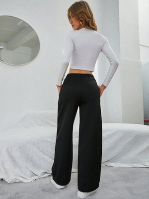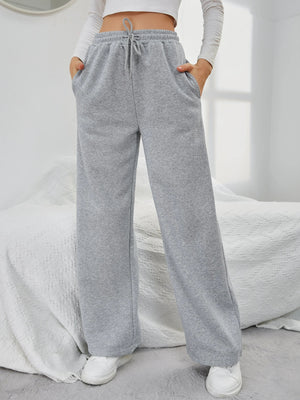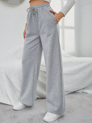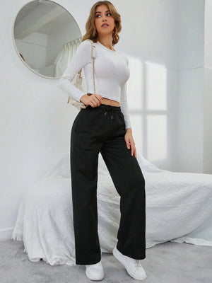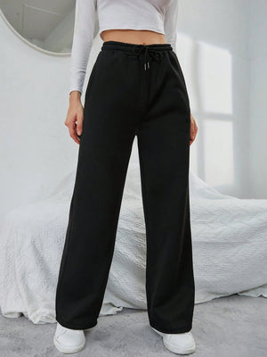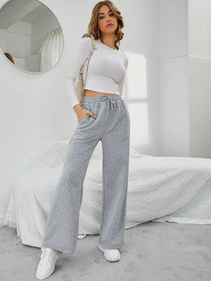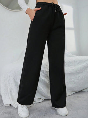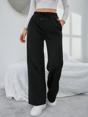 Stay cozy in these Solid Color Drawstring Jogger Pants. The drawstring waist and high waistline offer a comfortable and secure fit, while the slight stretch fabric allows for easy movement. Perfect for spring and fall temperatures, these wide leg pants provide both style and comfort. Machine washable for easy care.