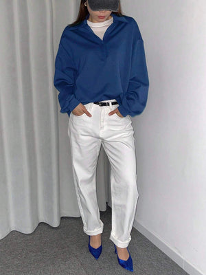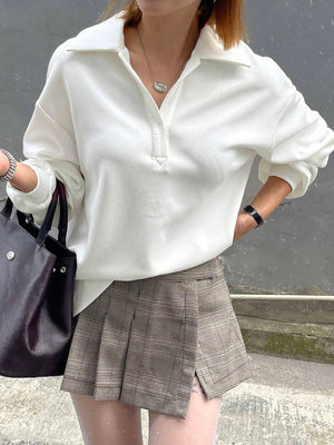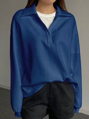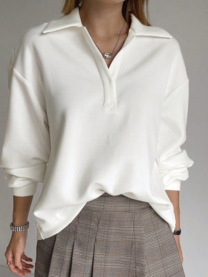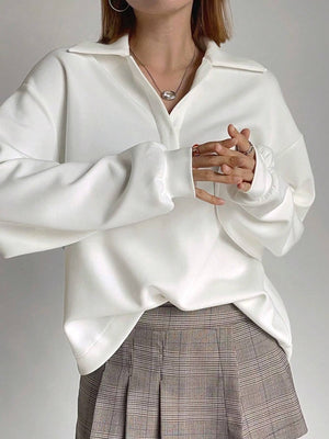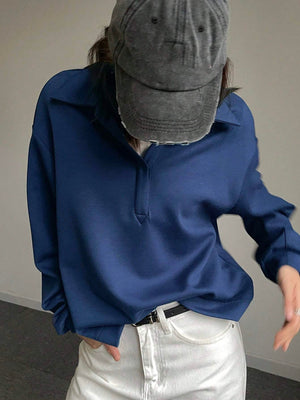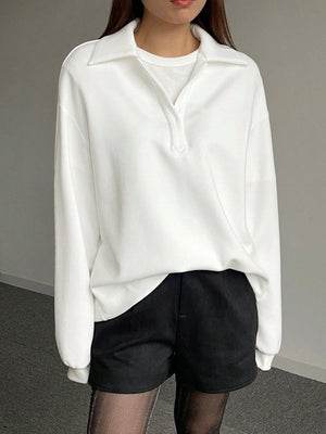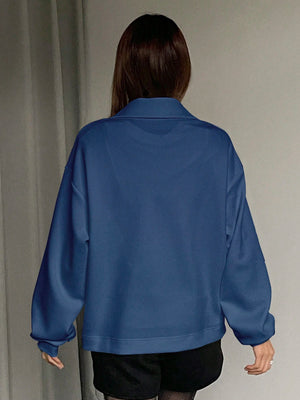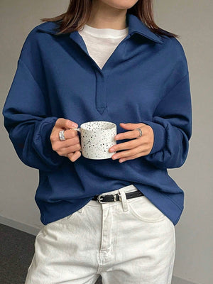 Stay effortlessly stylish with this solid color drop shoulder sweatshirt. Featuring a relaxed oversized fit and comfortable long sleeves, this casual piece is perfect for office wear or everyday activities. The half placket design with zipper detail adds a modern touch, while the medium stretch polyester fabric ensures all-day comfort. Ideal for spring and fall weather, this versatile sweatshirt is a must-have addition to your wardrobe.