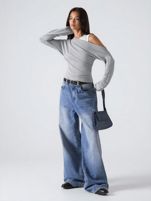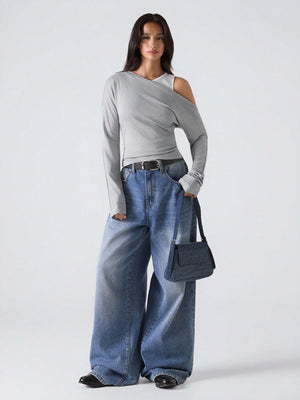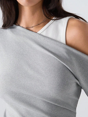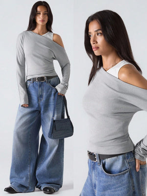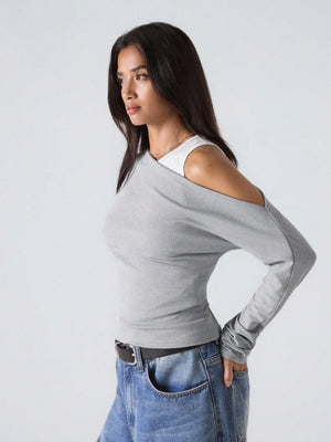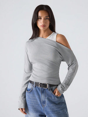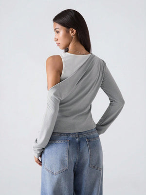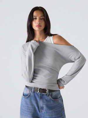 This woman's slim-fit grey top features an asymmetrical neckline with a stylish cold shoulder design, perfect for a minimalist yet fashionable look. Crafted from rib-knit fabric with ruched detailing, it combines comfort with subtle texture. Its long sleeves and regular length make it versatile for daily wear, suitable for casual outings, streetwear, or business casual settings inspired by Stockholm style. The round neck and regular hem shape contribute to a clean, contemporary silhouette.
